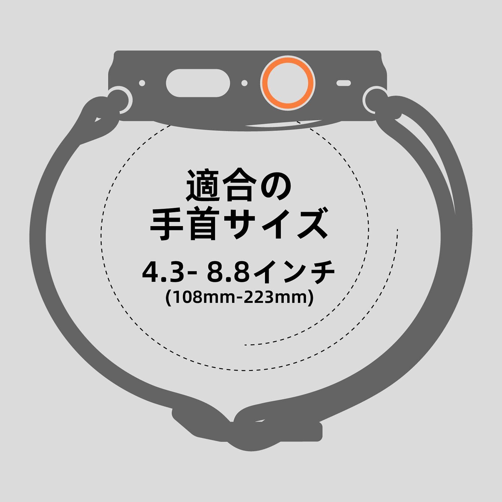 【対応機種・サイズ】このApple Watch スポーツバンドは Apple Watch Ultra2 /Ultra 49mm、Apple Watch Series SE 9 8 7 6 5 4 3の45/44/42mmに対応できます。 手首サイズは108-223mmの方に適します。長さも無段階で自由に調整可能で、どんな手首にフィットできます。