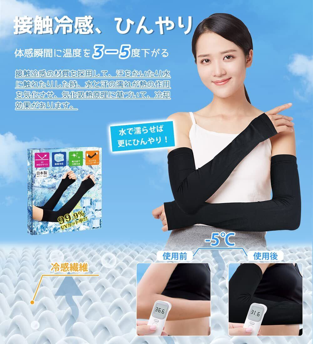 ❄【アームカバー 瞬間接触冷感−5℃を実現】肌に生地が触れた瞬時に、ヒンヤリとした冷感が持続します。接触冷感で夏でも、肌の熱を生地が吸い取ってくれるので、触った時に冷たく感じます。