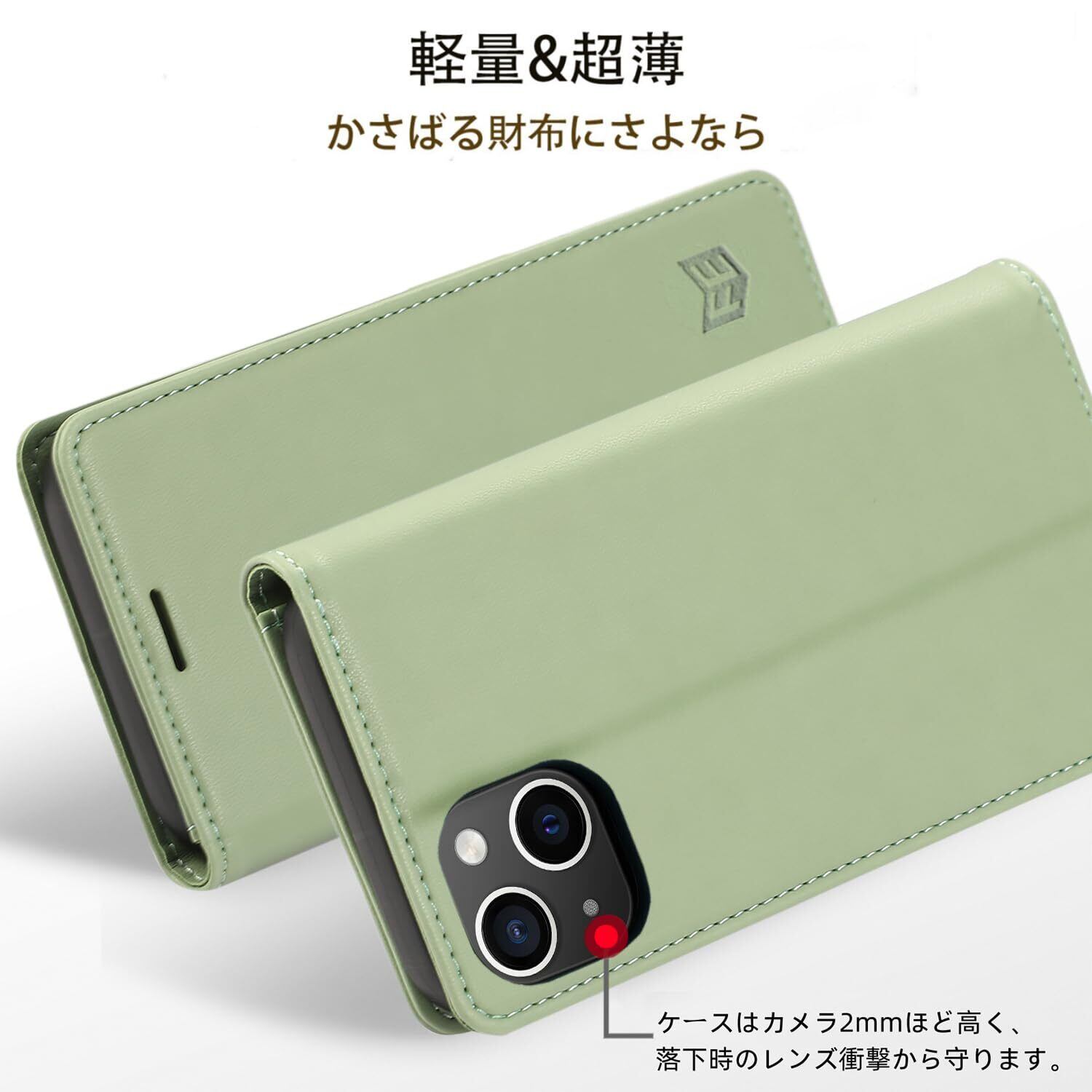iphone15ケース 手帳型 Iphone15手帳 ケース 耐衝撃TPU素材カード収納 マグネット内蔵スタンド機能付き アイフォン15携帯カバー全面保護 iPhone 15スマホケース 5G 6.1インチ対応, ライトグリーン