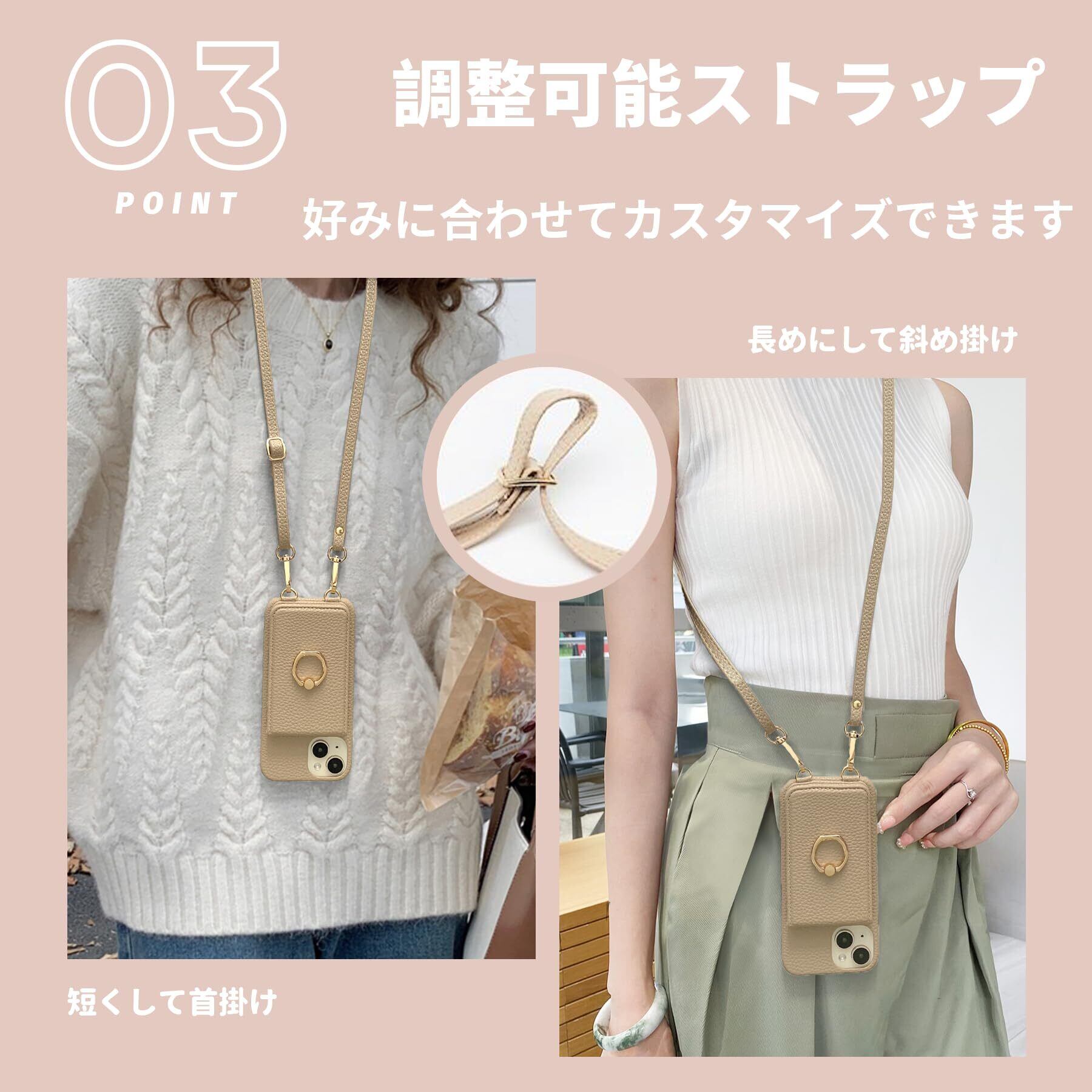 【ストラップの使い方は2 way】スマホケース iPhone 15 ショルダー 肩(首)掛けしたまま操作もできるのでスマホを無くしたり探したりする心配もありません。かけで両手がフリーどこに行く。