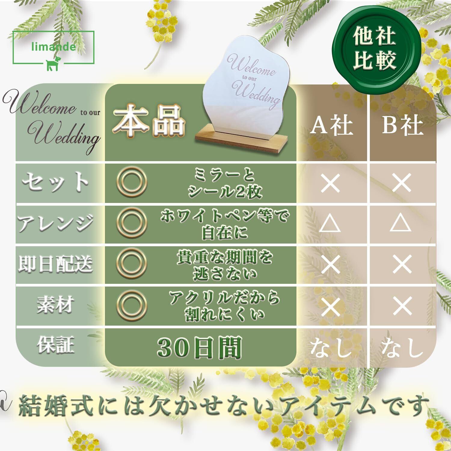 ウェーブミラー(アクリル素材だから軽量設計)、台座、転写ステッカーシール「Welcome to our Wedding」2枚付き。万が一失敗しても大丈夫!