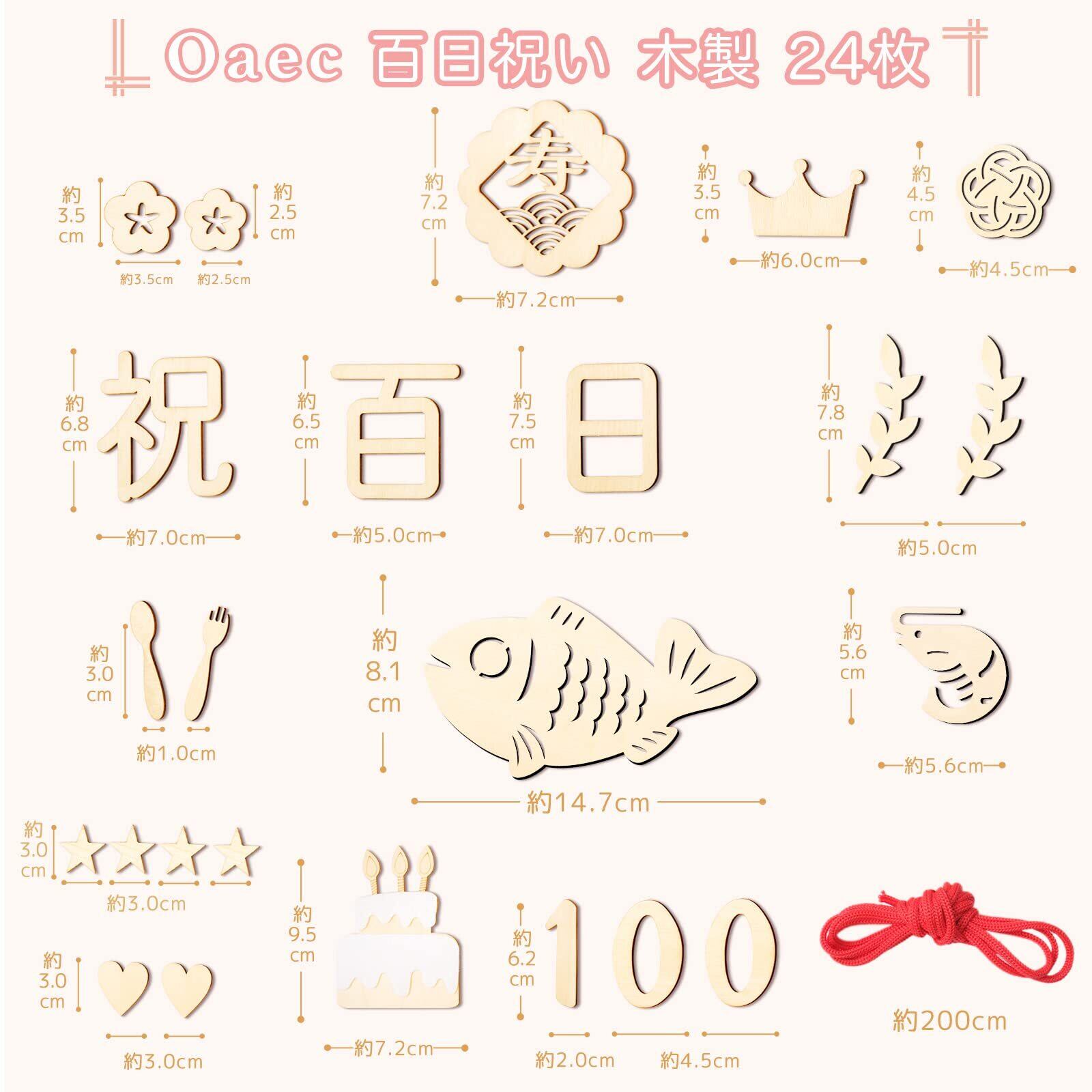 【豊富な要素】:「祝、百、日」各1枚、「魚」*1枚、「梅結び」*1枚、「エビ」*1枚、「寿」*1枚、「ケーキ」*1枚、「1」*1枚、「0」*2枚、「フォーク」*1枚、「スプーン」*1枚、「クラウン」*1枚、「葉」*2枚、「花」*2枚、「星」*4枚、「ハート」*2枚、合計 2 4 枚。厚さ約3mm。また、縁起を象徴する長さ2メートルの赤い縄も付いています。