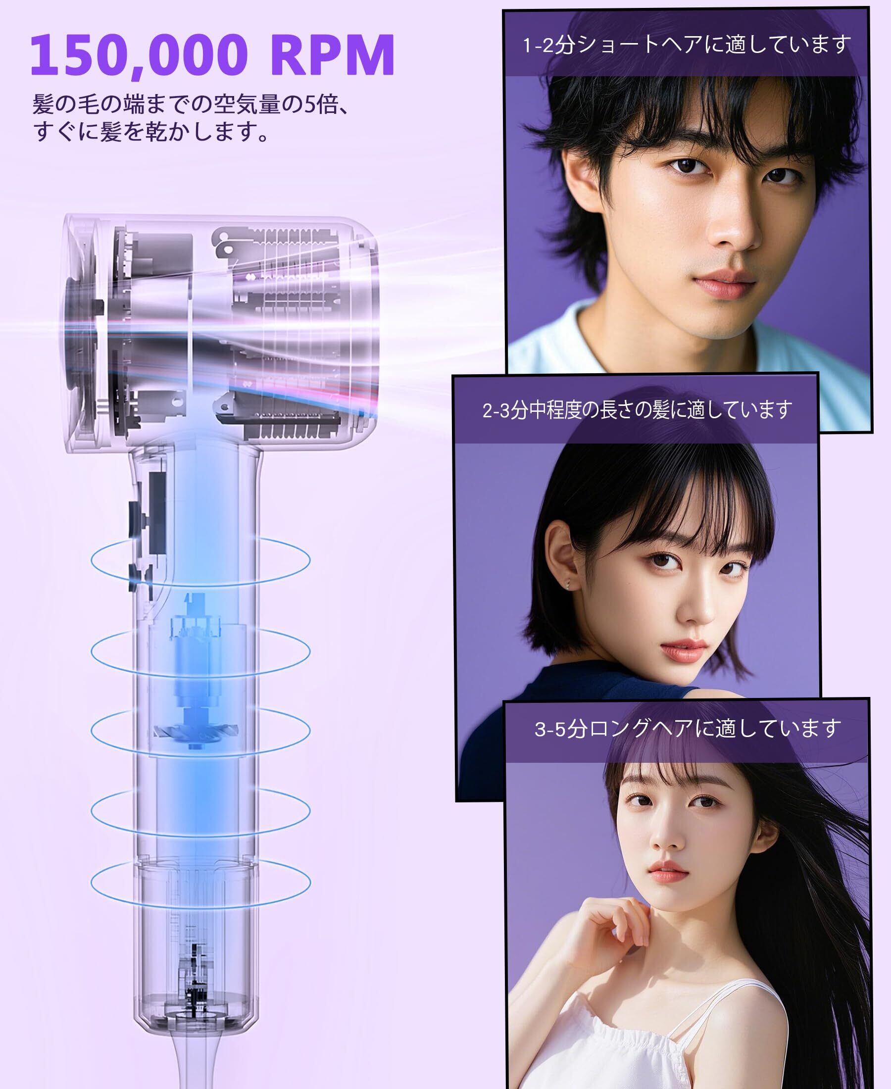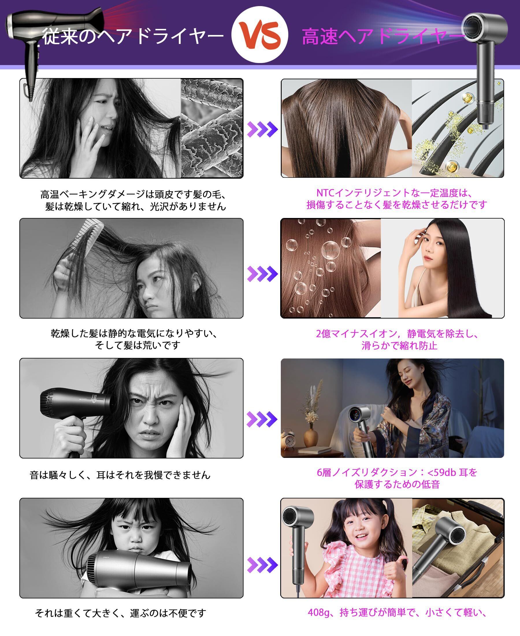 超高速乾燥:RXKJヘアドライヤーは150000 RPMの高速ブラシレスモーターを搭載しており、22m / sの衝撃的な風速を実現し、強力な気流が短時間で髪を乾かします。従来のヘアドライヤーの5倍の速さで、効率的で時間の節約になります。髪に優しくダメージを防ぎながら、自宅でサロン品質の仕上がりを再現します。ヒント: 取扱説明書に記載されている磁気ブラケットは別途購入する必要があります。