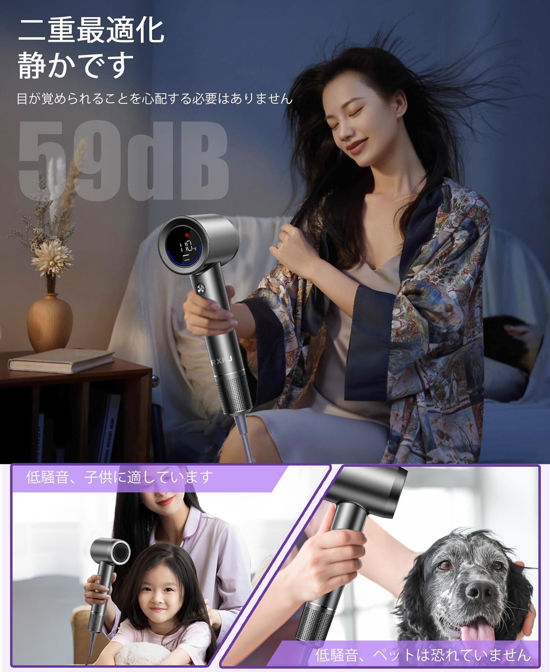 高速ドライヤー|2億濃度マイナスイオン×NTC知能温調1300Wで髪ダメージ防止!BLDC高速モーター+5段風量で1分速乾。LED表示/冷温風切り替え対応。マグネットノズル&フィルター手入れ楽々|59dB低騒音|自動OFF/サロン級仕様|家庭/出張利用に最適(PSE認証済・スタンド別売)