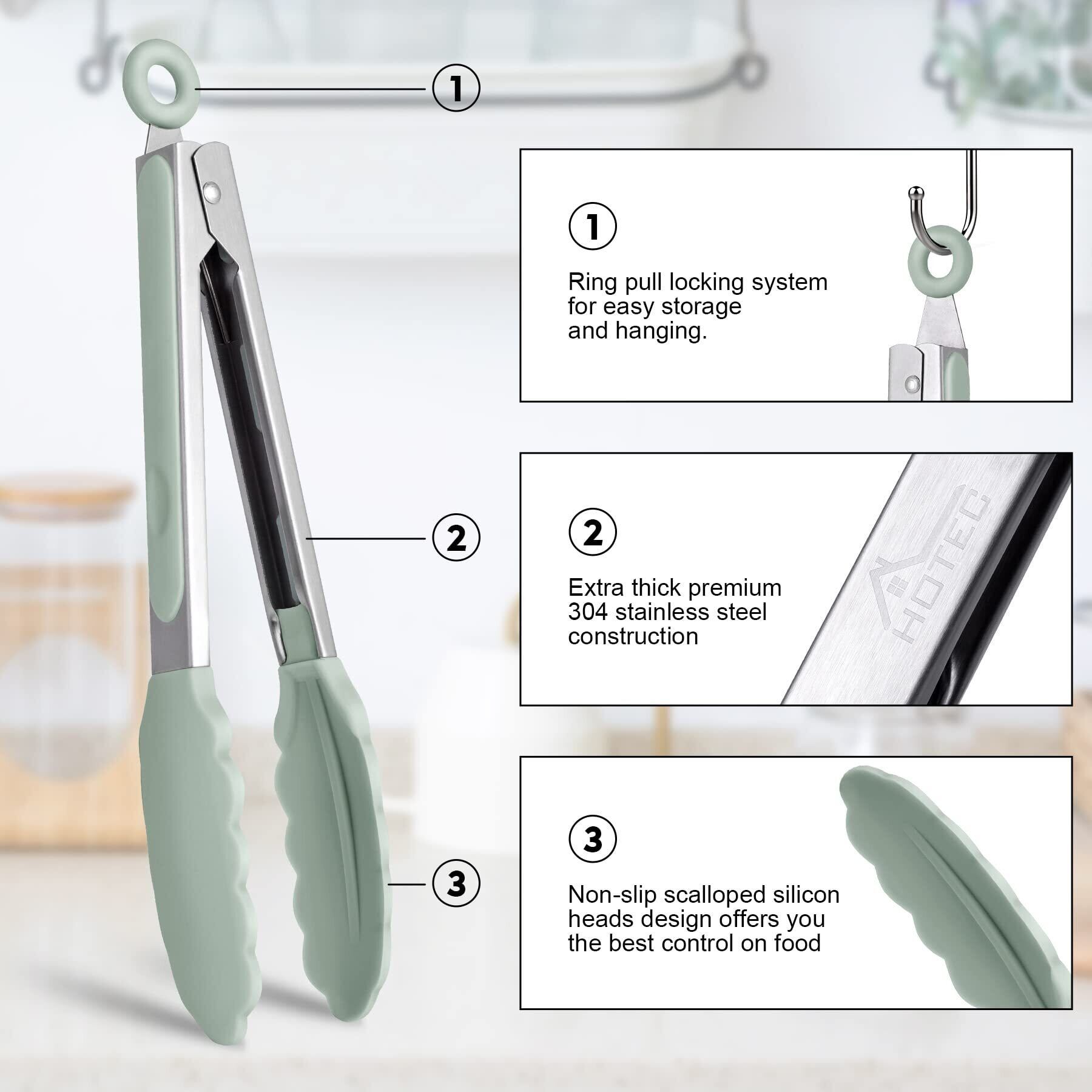 Hotecトング ステンレス キッチントング シリコン トング バーベキュー 焼き肉/バーベキュー用 耐熱抗菌 ロック収納 調理器具 2本セット(浅緑)