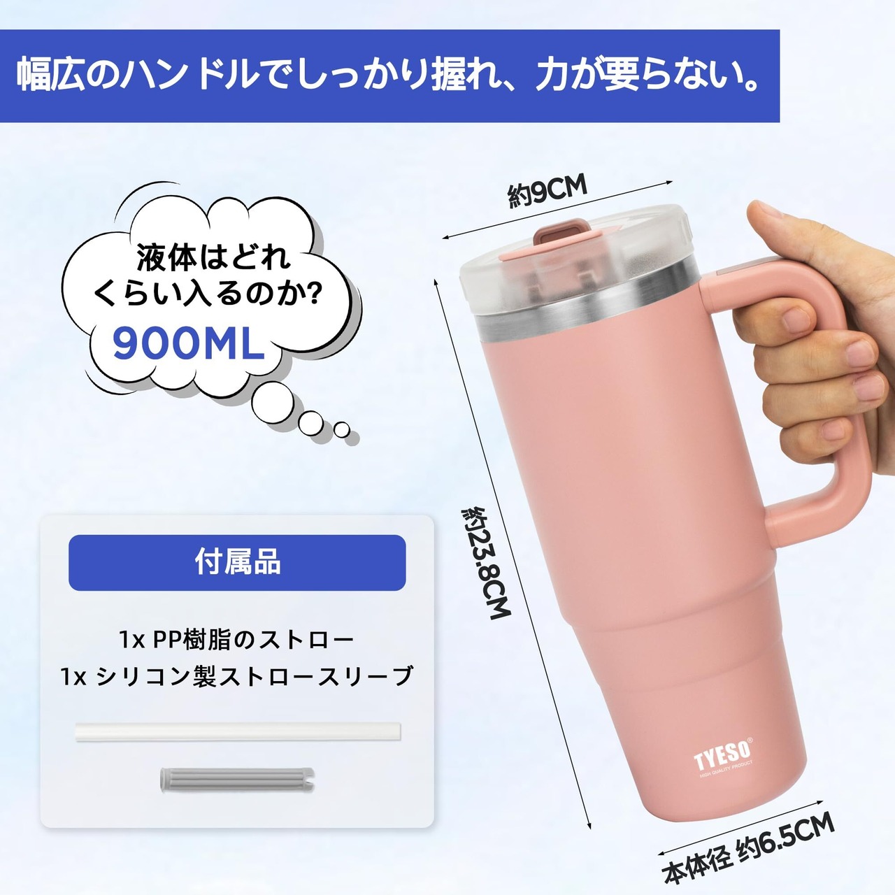 TYESO タンブラー 0.9L 水筒 保冷 ステンレスボトル ウォーターボトル ストロー 取っ手付き ジョッキ アウトドア 真空断熱 二重構造 広口 大容量 直飲 女の子 男の子 900ml 桃色