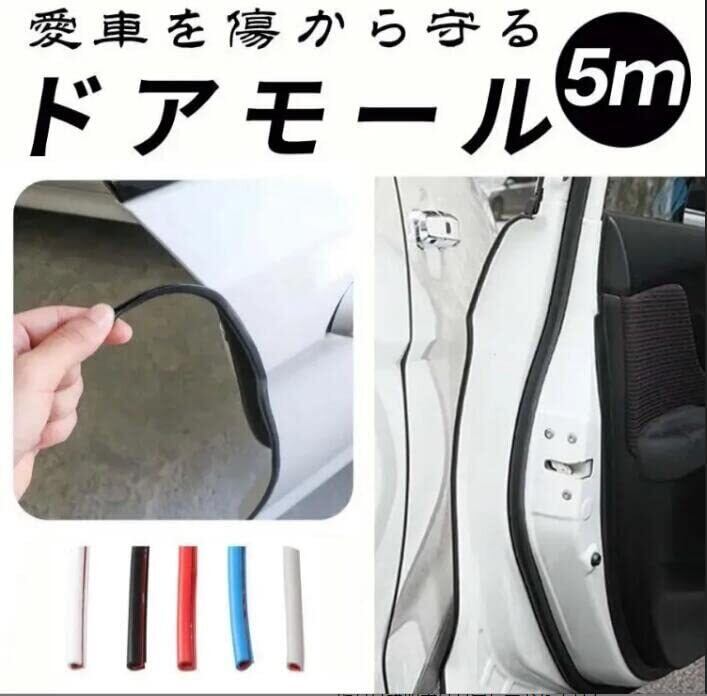 モールの幅も目立ち過ぎず丁度いいサイズ<br>車のドアオープン時(開閉時)に隣の車や壁などへの接触による衝撃緩和やキズを防止します。<br>ドアのエッジに挟み込むJ型タイプ、両面テープ付きなのでしっかりと取り付けできて自然な仕上がりになります。<br><br>選べる5カラー<br>■■■■カラー: ブラック、ホワイト、グレー、レッド 、ブルー<br><br><br>・サイズ:全長約5m<br>・素材: PVC樹脂<br>取付け説明書は付属しておりません。