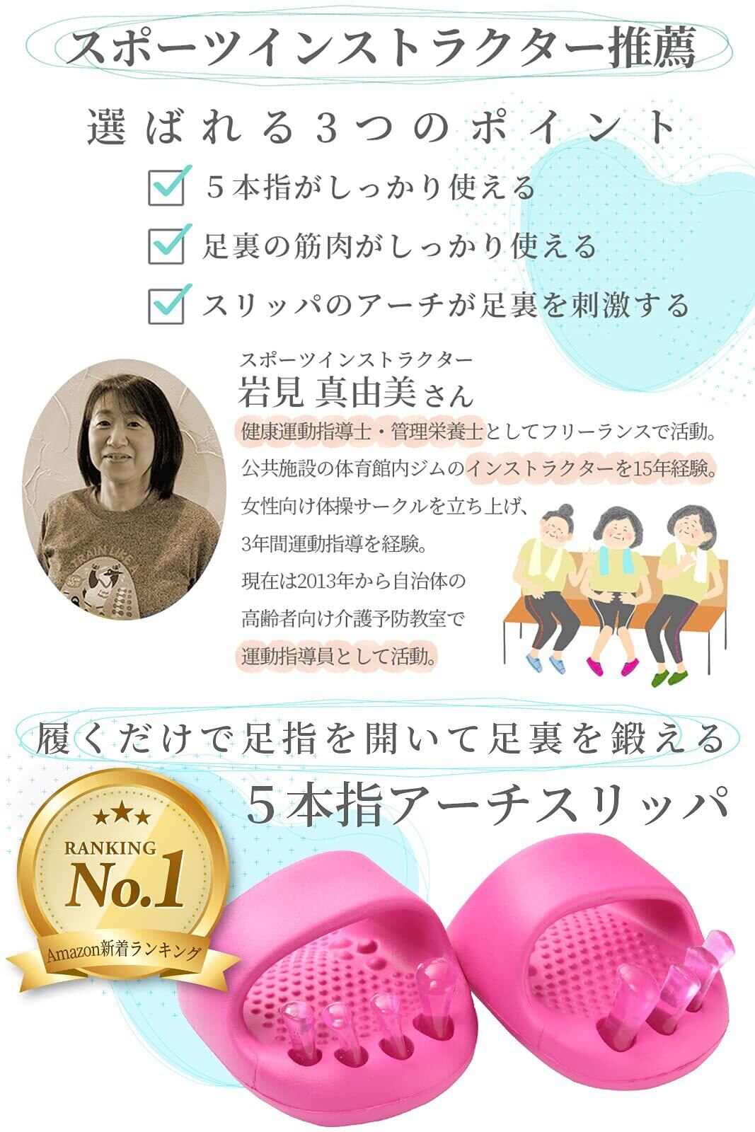 【■スポーツインストラクター推薦!】《①指が開く②土踏まずに沿うアーチ③足裏筋肉をしっかり使える》①つま先の5本指トゥパッドが指の間に入り込んでぐっと開きます。②底面は、親指つけ根からかかとを結ぶ"土踏まず"のアーチに沿う形状。③だからつま先と土踏まずに踏ん張る力が入り、足裏の筋肉をしっかり鍛えます。スポーツインストラクター岩見真由美さんご推薦品。[適応足サイズ]22~24.5cm 【2021.9.22 新着ランキング第1位を取得しました!】
