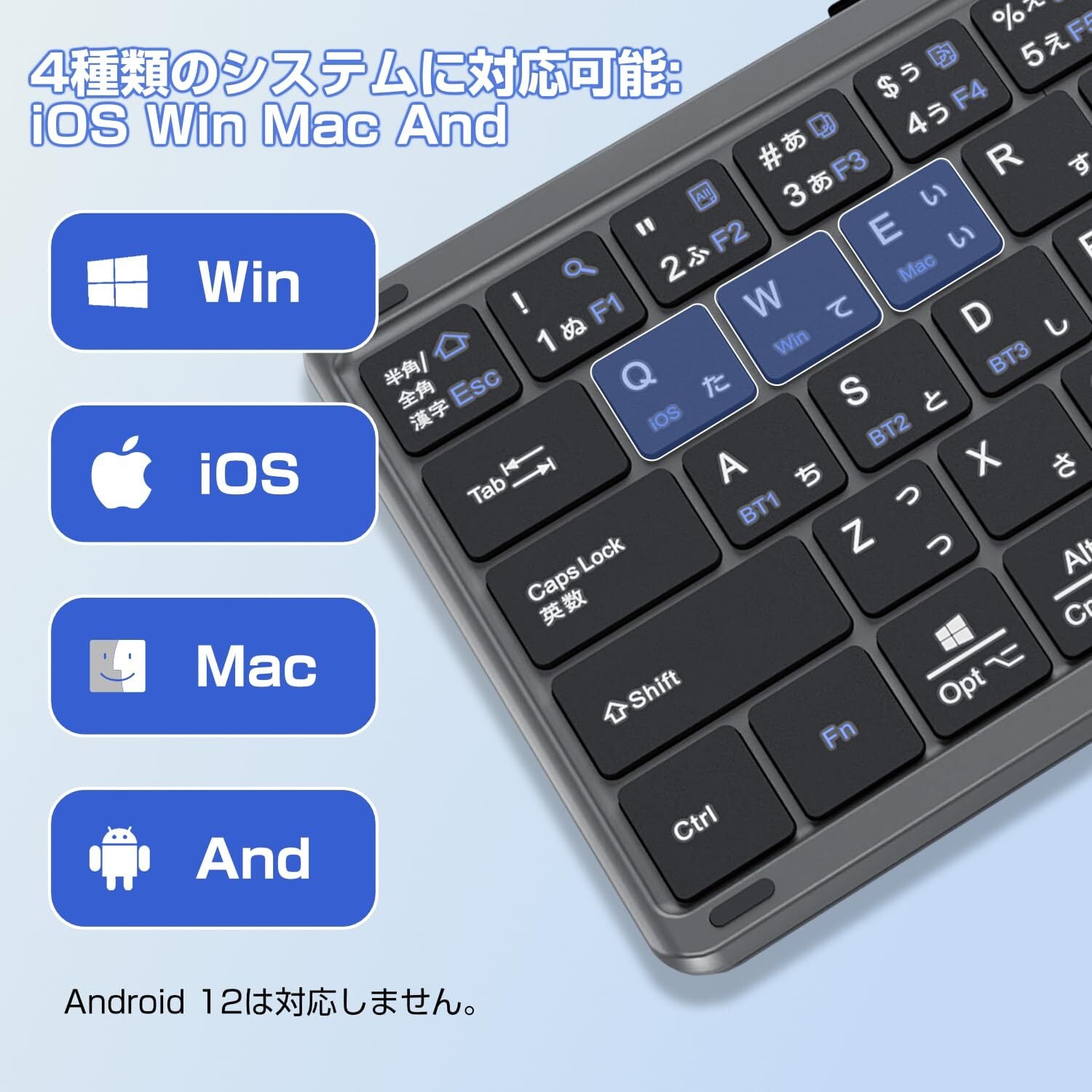 【3台までのマルチペアリング・4システム対応】:この折りたたみキーボードはiOS、Windows、Mac、 Android システムに対応します。様々なデバイス適用し、同時に3台のデバイス接続でき、ワンタッチで使用してデバイス間ですばやく切り替えることができます。スマホ、ipad、ipad mini、ipad air、タブレットPCの間で自由自在に切り替えます。業界での最先端技術を採用し、Bluetooth5.2チップ搭載し、安定した通信、快適に操作できます。注意: Android 12に対応しません、Android 12のデバイスに接続する必要があり、Androidバージョンを選択してください。
