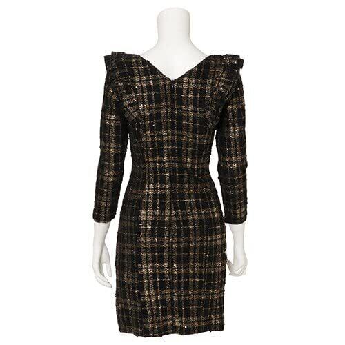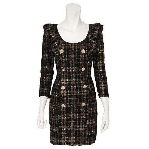 トラディショナルなツイードチェックのミニ丈ドレス(キャバドレス・CABARETDRESS)。クラシカルなツイードチェックが上品な、肩のフリルがアクセントのミニ丈袖ありワンピース。フロントのゴールドボタンがトラディショナルな雰囲気を醸し出す高見えデザインです