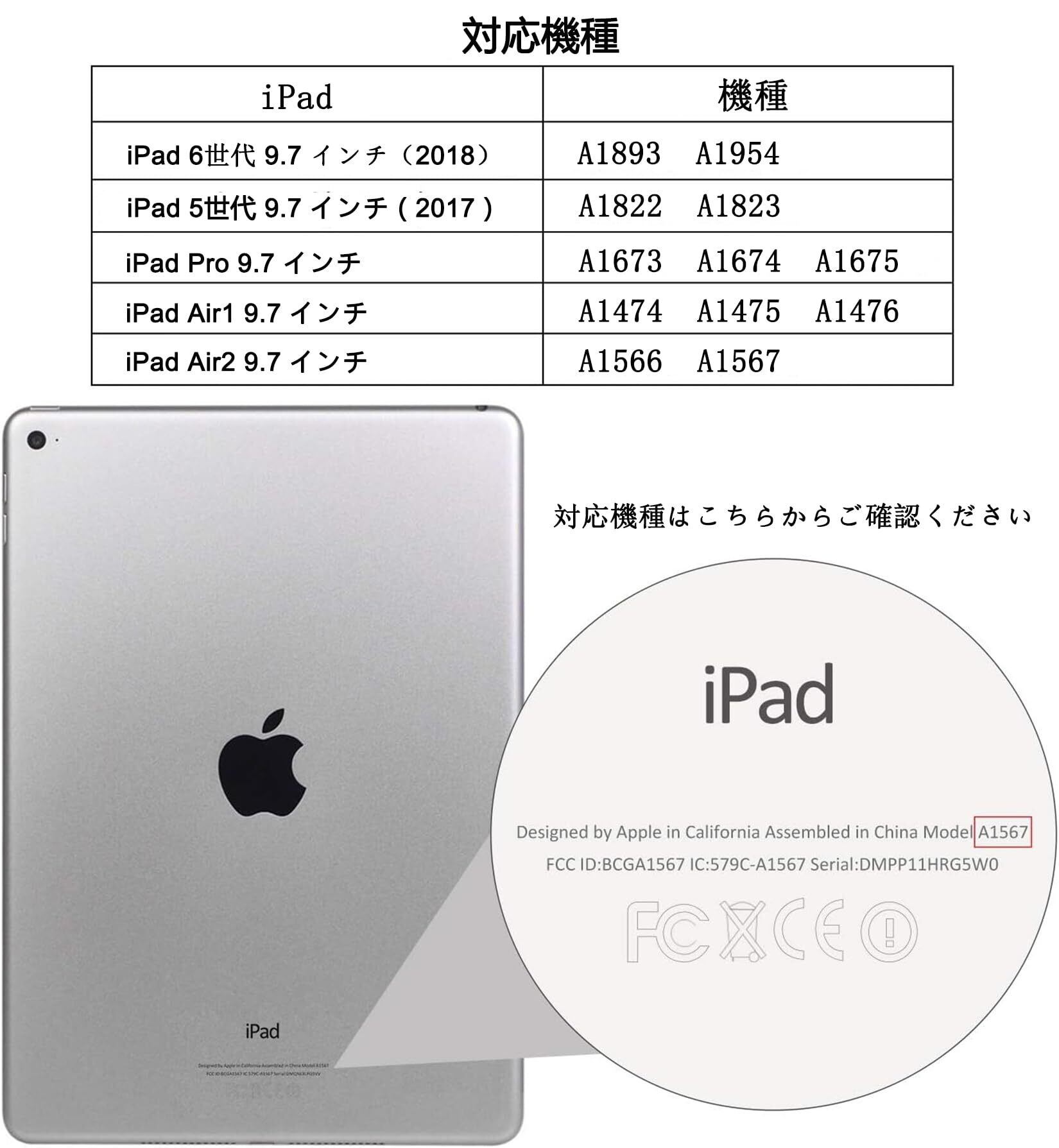 iPad 9.7 2018 2017 第6世代/第5世代/Air2/Air/iPad Pro 9.7専用 。対応モデル:A1474/A1475/A1476/A1566/A1567/A1673/A1674/A1675/A1822/A1823/A1893/A1954。iPadの背面からモデルを確認してください。他のiPadモデルに対応できません。