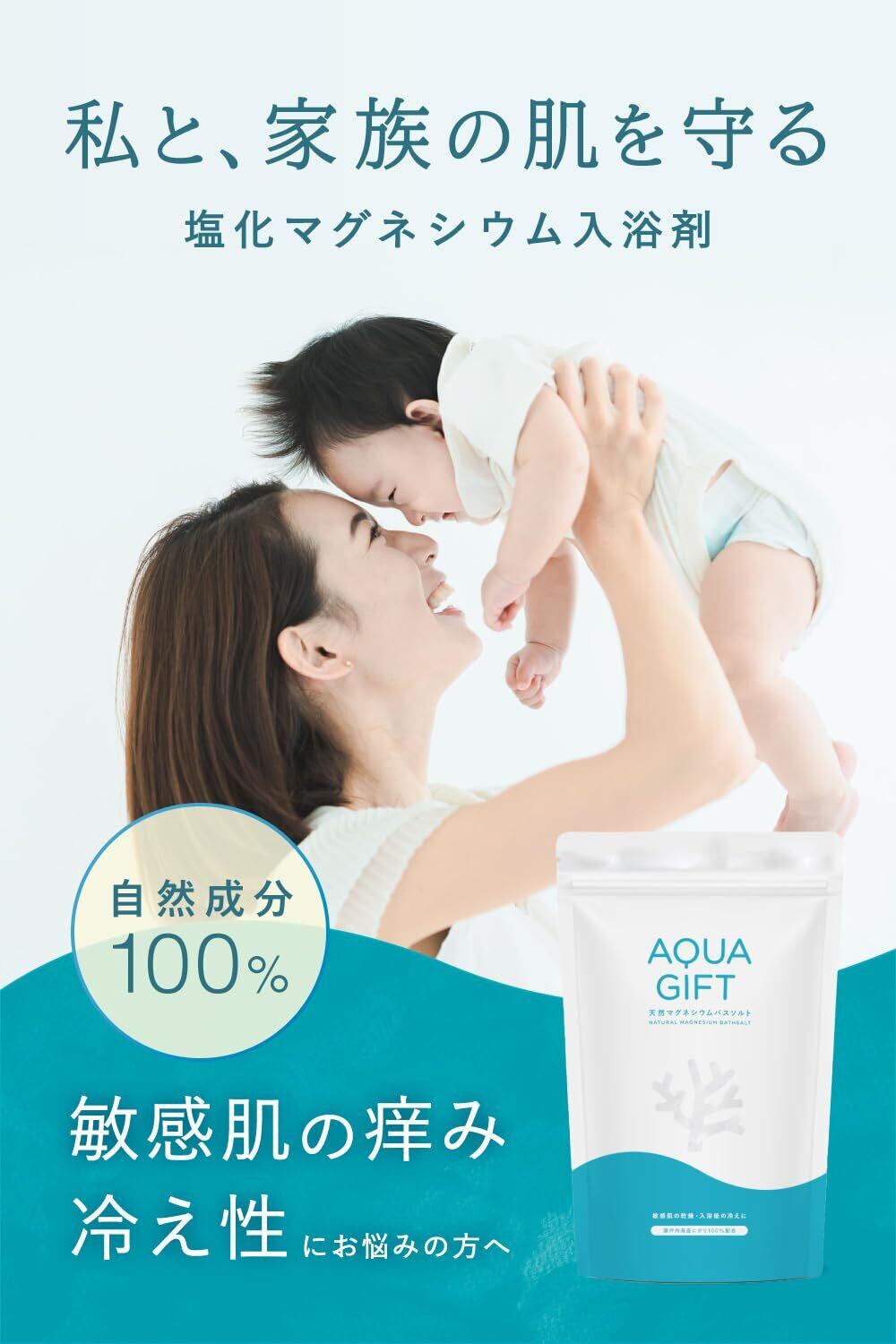【毎日、直接肌に触れるからこそ自然成分100%】アクア ギフト は アトピー 肌を発症した娘のことを思って作られました。我が子を思ってできた商品だからこそ、少しでも不安のある化学物質は使用したくない。辿り着いたのは自然成分100%のバスソルトでした。