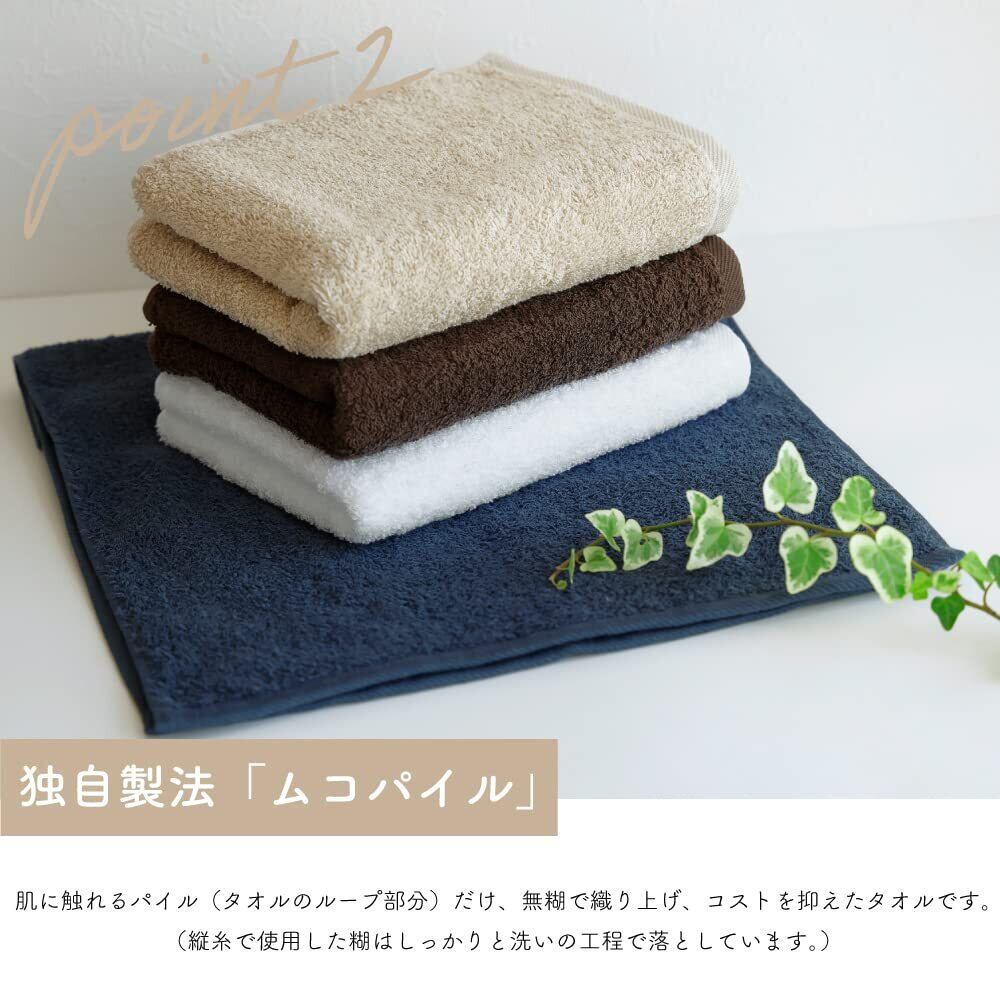 【ムコパイル】パイル部分に糊を使用してません。 パイル(タオルのループ)は肌に触れる部分で、風合いに左右されます。一般的なタオルは綿糸に糊をコーティングしないと織ることができないが、新田タオルは糊を付けずに織ることができます。その工程を省くことで綿本来の優れた吸水性と風合いを保ち、一般的なタオルに比べて、ソフトな風合いに仕上がっています。