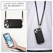 Shlybaay iPhone 15 対応 ケース 背面 手帳型 カードケース iPhone15 用 ショルダー ストラップ 手帳型ケース キルティング いphone 15 アイホン 15 用 スタンド 肩掛け カード収納 斜め掛け 首掛け PUレザー マグネット 可愛い チェック柄 格子柄 女性 菱形 おしゃれ 6.1inch ブラック