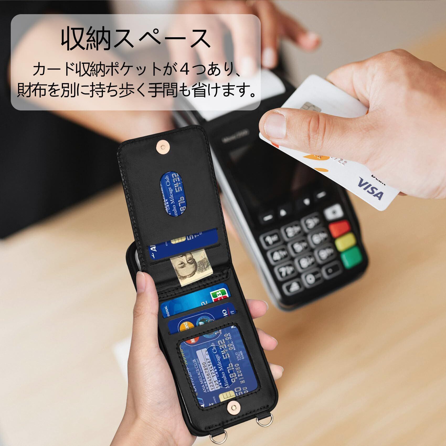 【多機能】❶ 収納機能:背面に4つのカードポケットがあり、カード、名刺、定期券、免許証、写真などを整理して持ち運べます。マグネット式開閉で、収納物が落ちる心配もありません。シンプルで便利な縦型開閉デザインが特徴です。❷ スタンド機能:縦置きスタンド機能があり、背面を開けるとビデオ通話や動画再生、レシピ閲覧などのハンズフリー操作が可能です。