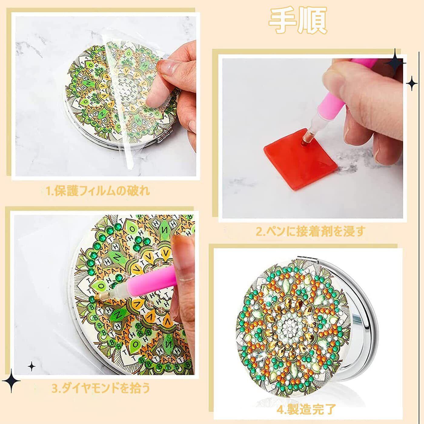 【初心者や子供ご心配なく】両面鏡の番号に対応するダイヤモンドをトレイに注ぎ、両面鏡覆っているフィルムをはがし、両面鏡の番号に合わせて対応するダイヤモンドを鏡に貼り付けます。ユニークで美しい曼荼羅手鏡が出来上がります
