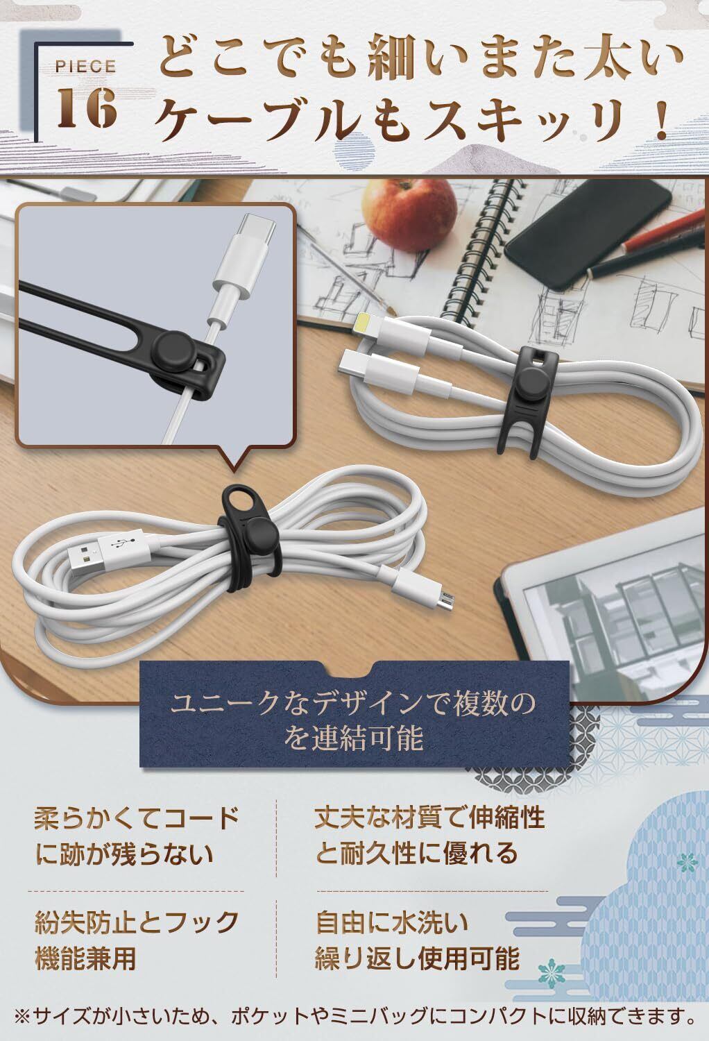 Viaky ケーブルバンド 高弾力 結束バンド 多機能クリップ 紛失防止・フック機能 兼用 3倍まで引き伸ばせ 収納バンド 連結可能 オフィス イヤホン コードまとめる 配線整理 家庭用収納 目印 水洗い可能 再利用可能 ブラック 16本セット | hananoki