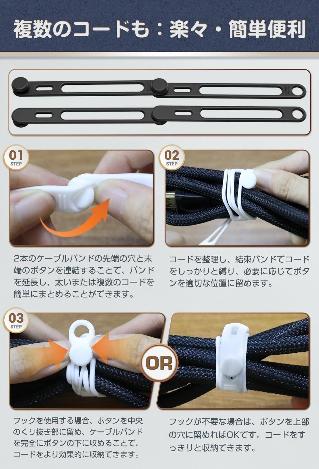 【連結可能】普段、ほかの同じタイプの従来品をお使いの際、その製品が短すぎて複数本または太いコードを収納できないことにお困りではありませんか?このケーブルバンドはそのような問題を解決できます!独特なデザインにより、2本のバンドを先端の丸い穴と末端のボタン部分を連結して簡単に延長することができます。これにより、複数本のコードや太いケーブルを簡単に収納することができます。