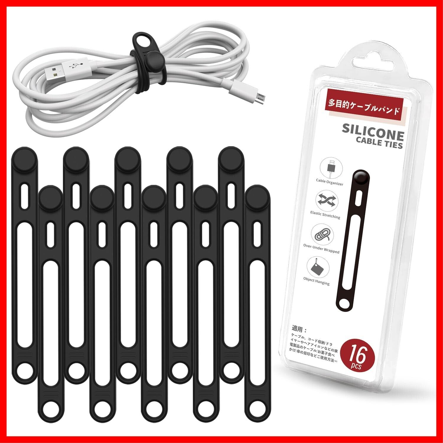 【多機能ケーブルバンド】材質:高弾性で丈夫なシリコン、サイズ:105mm×12mm×6mm、重さ:2.3g/本、個数:16本セット、色:ブラック。伸縮性と耐久性に優れ、最大3倍の長さに引き伸ばせます。柔らかい素材でコードに跡が残らず、水洗い可能で繰り返し使用可能。とても軽量で家庭・オフィス用はもちろん、外出時のイヤホンなどの持ち運びなどにも便利で、旅行・屋外にも適用します。