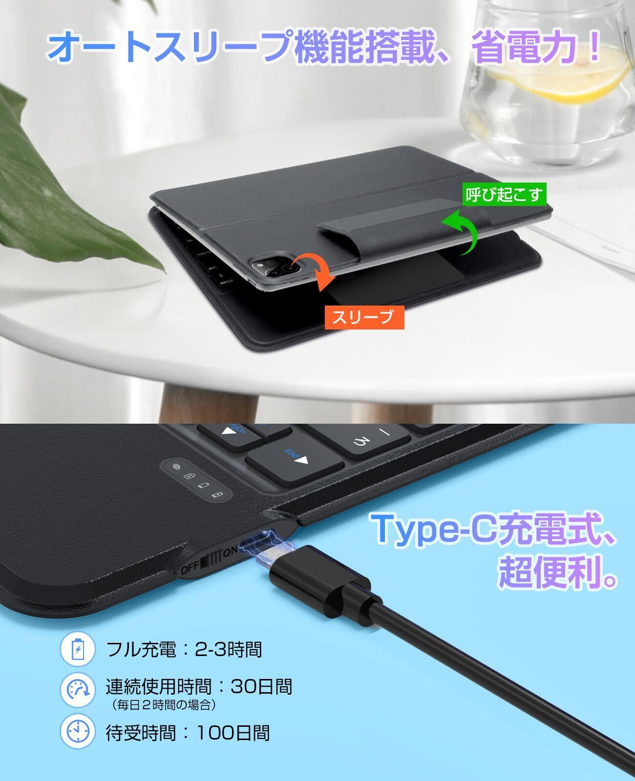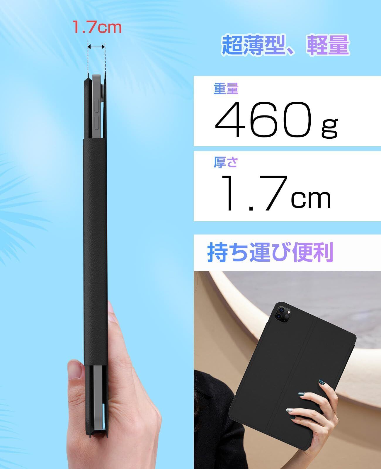 【一体型&磁気吸着式&超薄型&軽量】 ご注意:iPhoneではトラックパッドが使用できませんが、予めご了承ください。iPad本体とiPadペンが付属しないのです。この10.9/11インチiPad キーボード付きケースは、bluetooth キーボードとケースが一体型で、ほかの脱着式キーボードケースよりもっと薄くて軽量、厚さは1.7cm、重量は460g、持ち運びに便利。また、ケースにマグネットを内蔵し、ケースとiPadをしっかり吸着させます。ケース材質が丈夫で手触りも良いです。スタンド機能搭載で、iPadを立てかけることができ、横置きも縦置きもオッケー、映画鑑賞にはもちろん、仕事用や勉強用にもおすすめ!