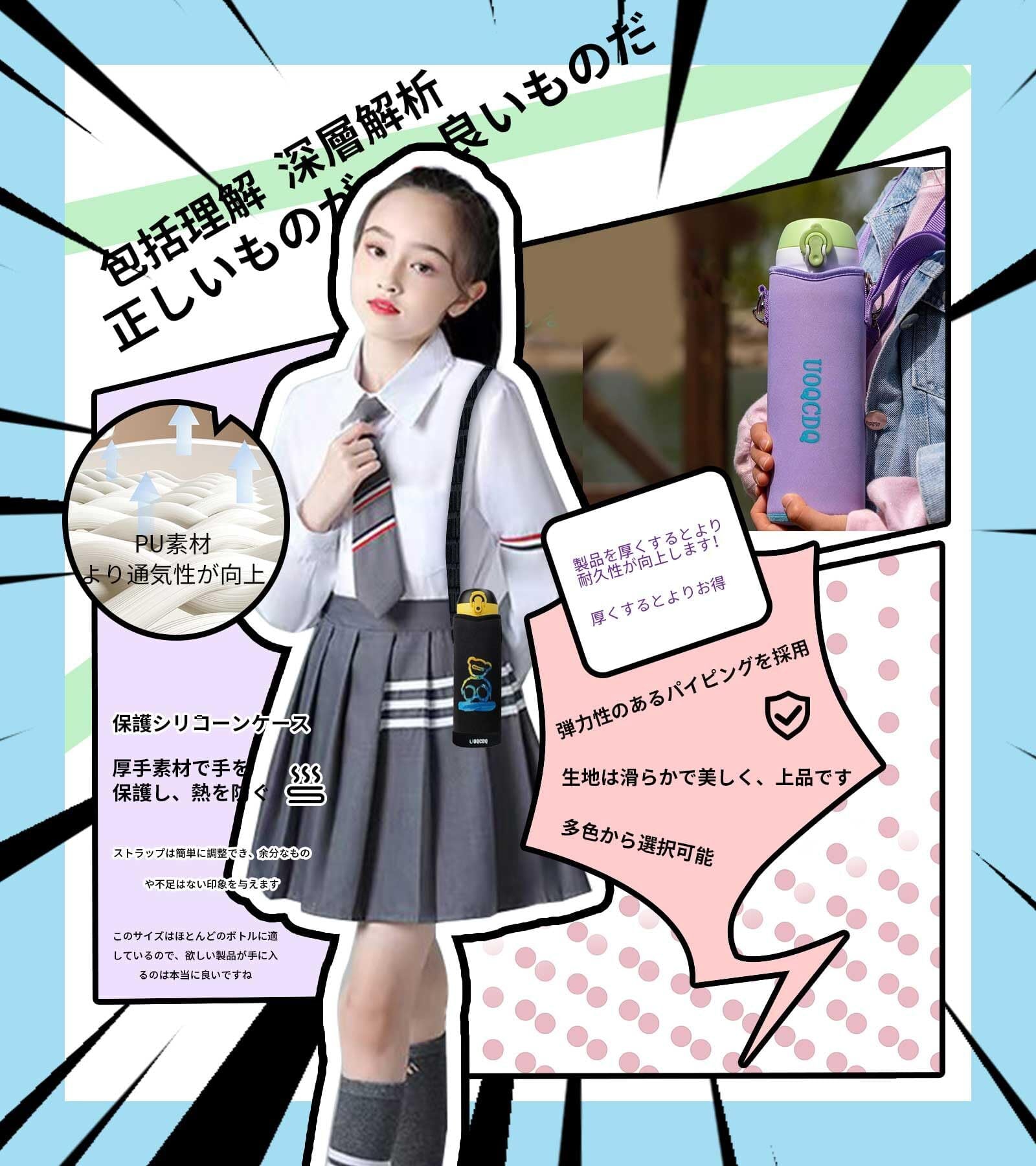 は大変便利です。当社独自の縫合技術で作られているため、美しく丈夫で、子供たちの水筒を長期間にわたって守ります、お子様が楽しんでご利用いただけますようお願い申し上げます