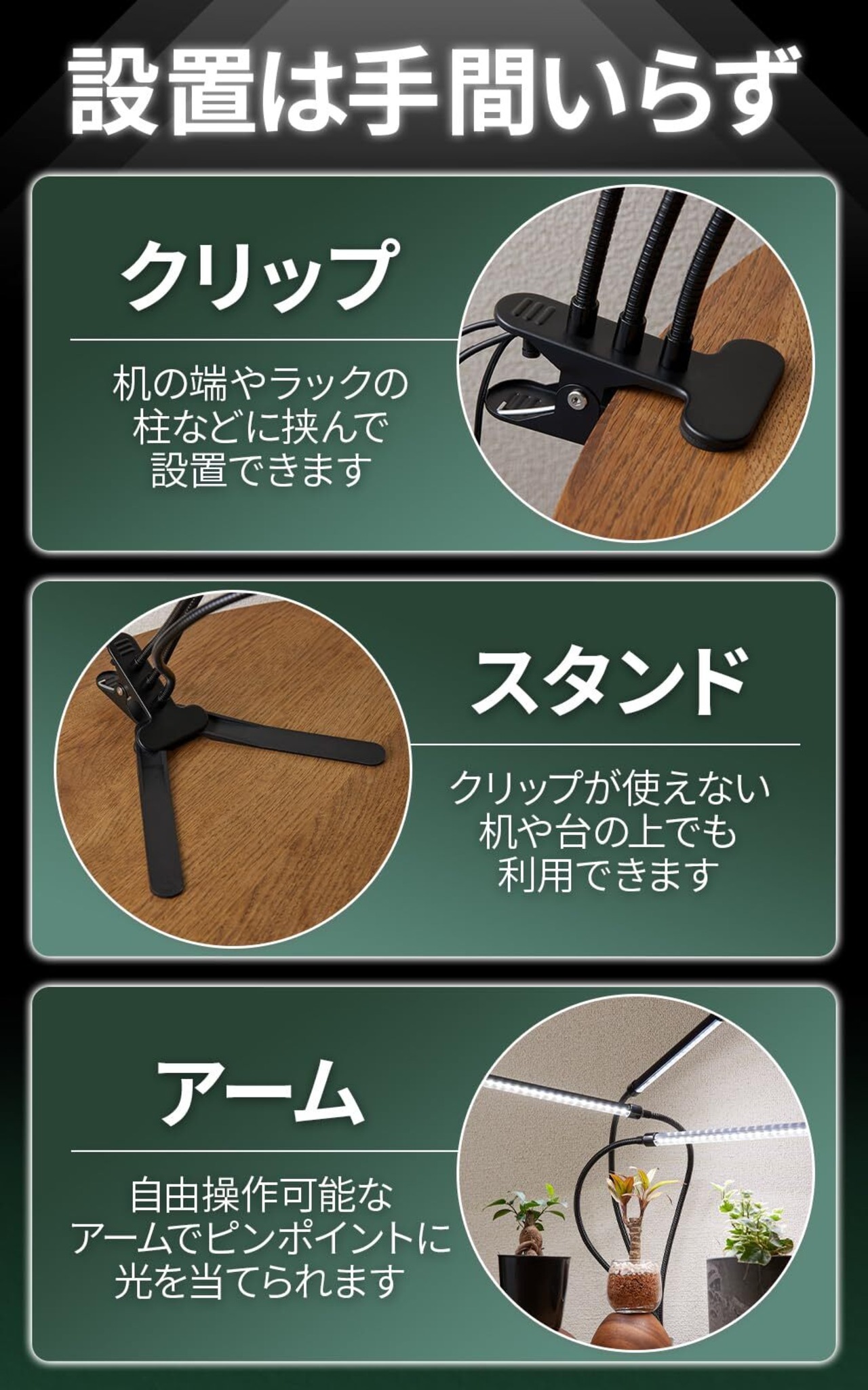 【設置は手間いらず】クリップで机の端や柱に、スタンドで机や台の上に簡単に設置できます。自由操作可能なアームでピンポイントに光を当てられます。