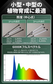 【植物育成をもっと便利に】●リモコン操作可能:12メートル以内の距離から操作可能。●記憶式タイマー:4H・8H・12Hの3モード。最初の点灯時刻に毎日自動点灯。●10段階調光:1〜10段階まで調光可能。●点灯本数切り替え:1・2・3本と点灯本数の切り替えが可能。