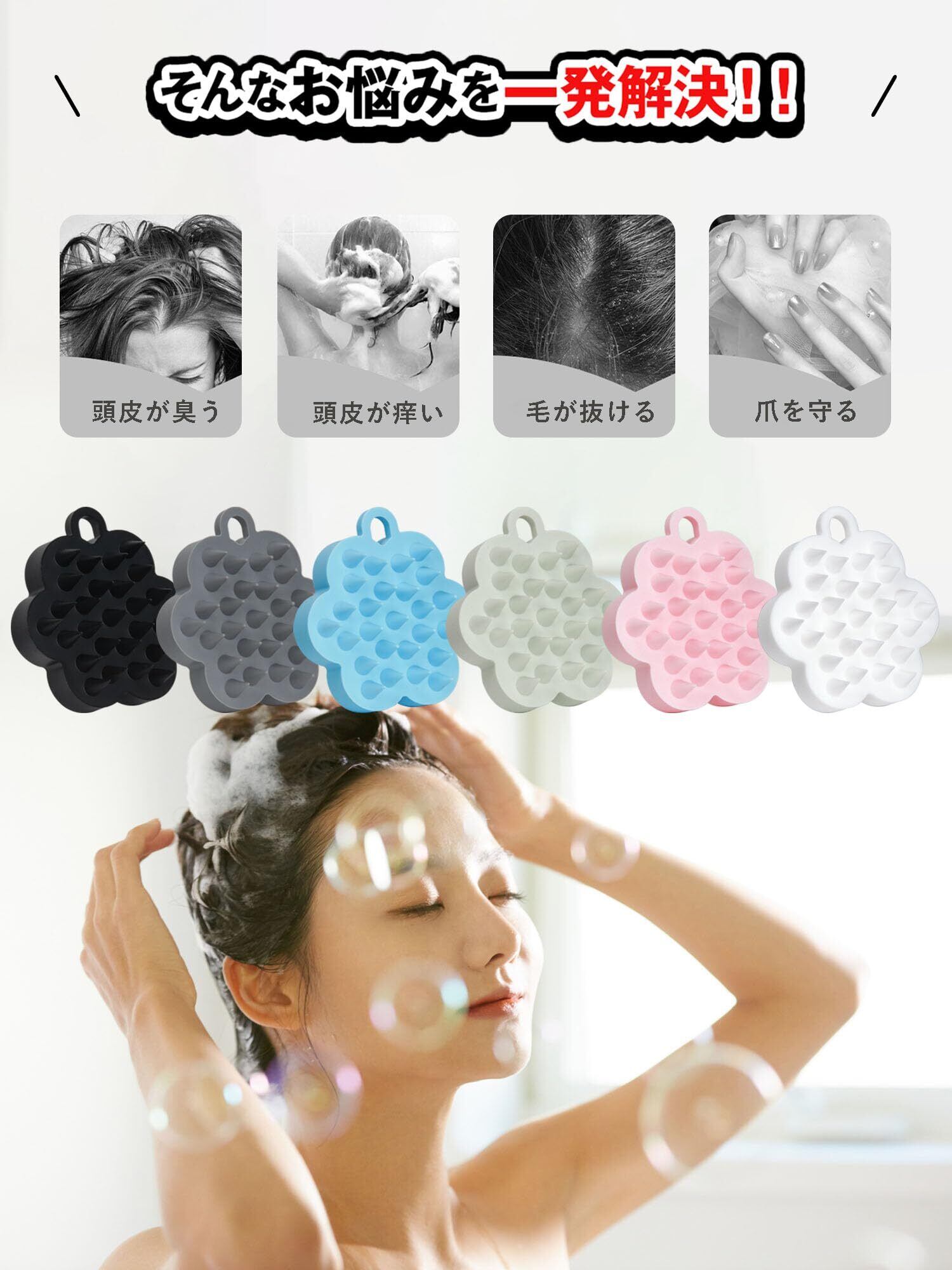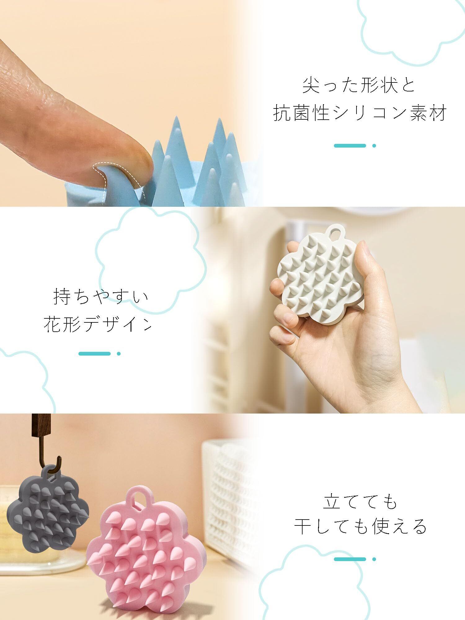 【こだわりのデザイン】人間工学に基づき開発しました。手のひらに乗るのにぴったりな、花型のデザインがおしゃれでかわいいです。しなやかで適度な柔らかさを持つ突起は、頭皮を傷めず地肌に効率的にアプローチ。フック穴付きなので、使用後の水捌けがよく耐久性も抜群です。良いものを長く使いたい方におすすめです。