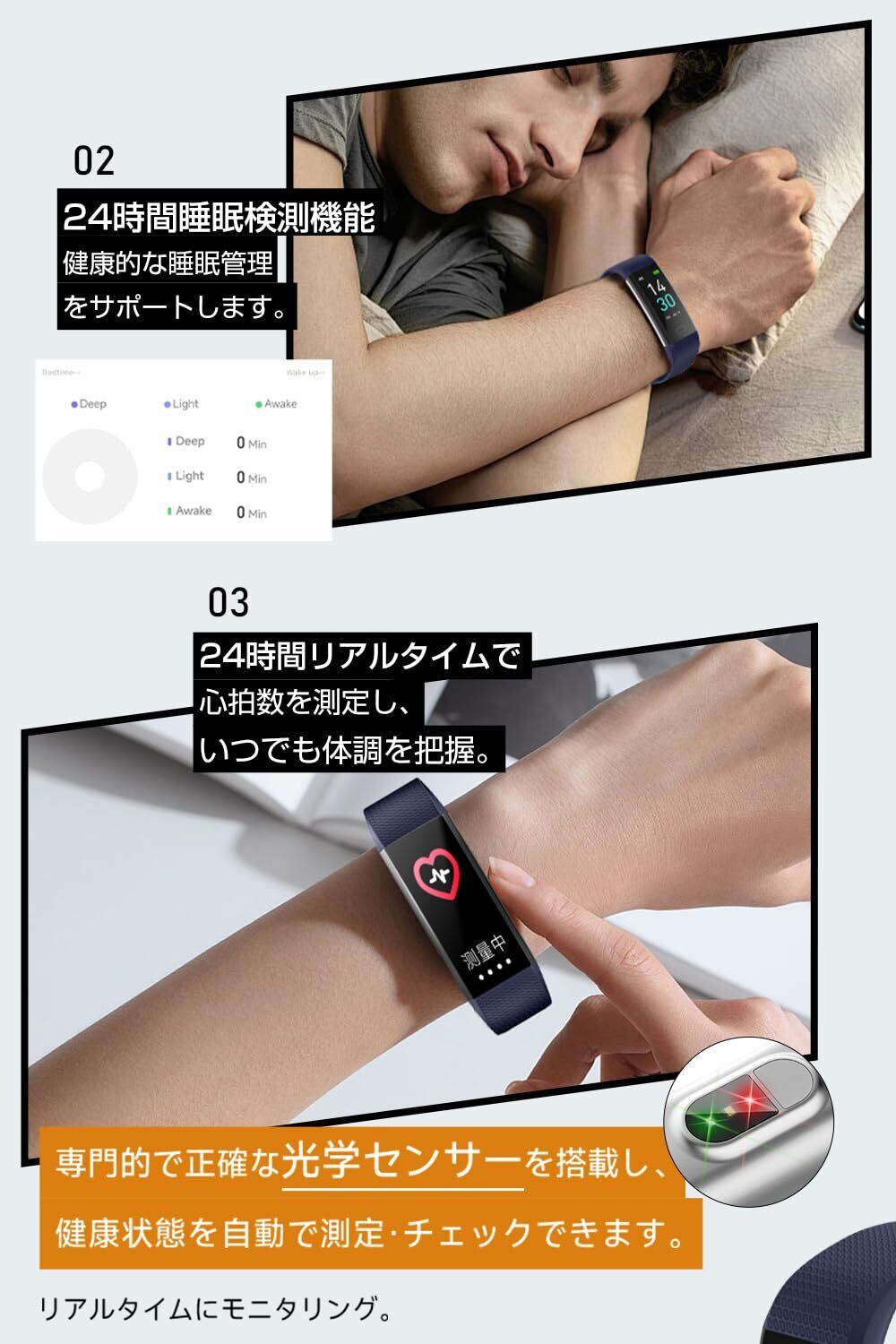 【睡眠記録&座りがち注意】スマートブレスレットを着けば、リアルタイムで、睡眠状態を検測できます。アプリで、座りがち注意を設定すれば、定時に振動でお知らせします。もっと健康な生活スタイルを提供致します。