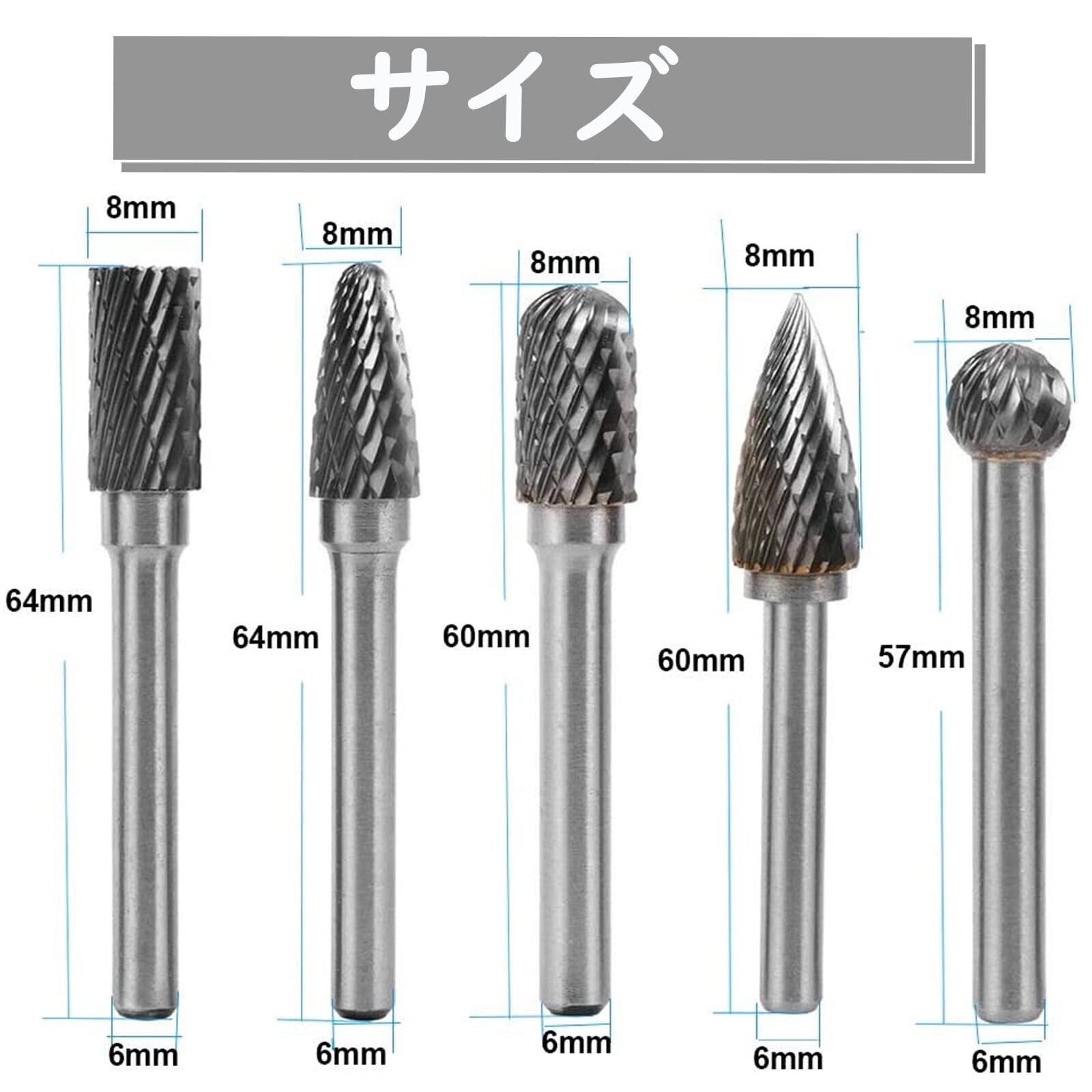 このタングステンバーセットはφ6mmシャンクです。軸径(mm):6mm 刃径(mm):8mm 全長:57-64mm