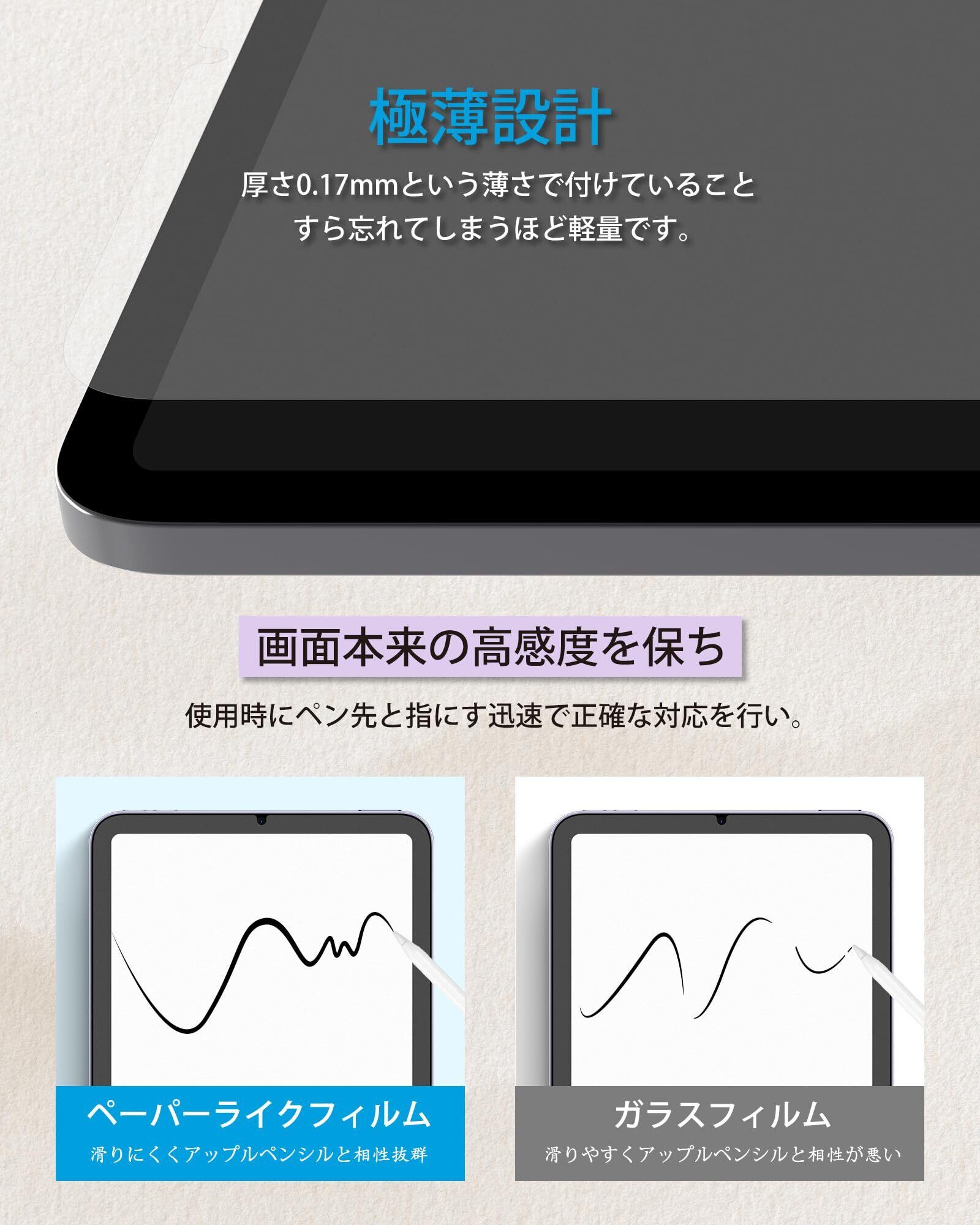 【紙のような描き心地】iPad mini7 フィルムの正面に日本からの高密度素材を採用しており、紙の摩擦と抵抗があるので、iPadユーザーが紙に描くような感覚を提供して、書く、描画、ノートの書き込みなど書くことに集中できます。なお、ペーパーフィルムはApple pencilと交換性が有ります、大幅にペン先磨耗防止、Apple Pencilでのストロークが滑らかで自然に感じられるような書き心地を実現。