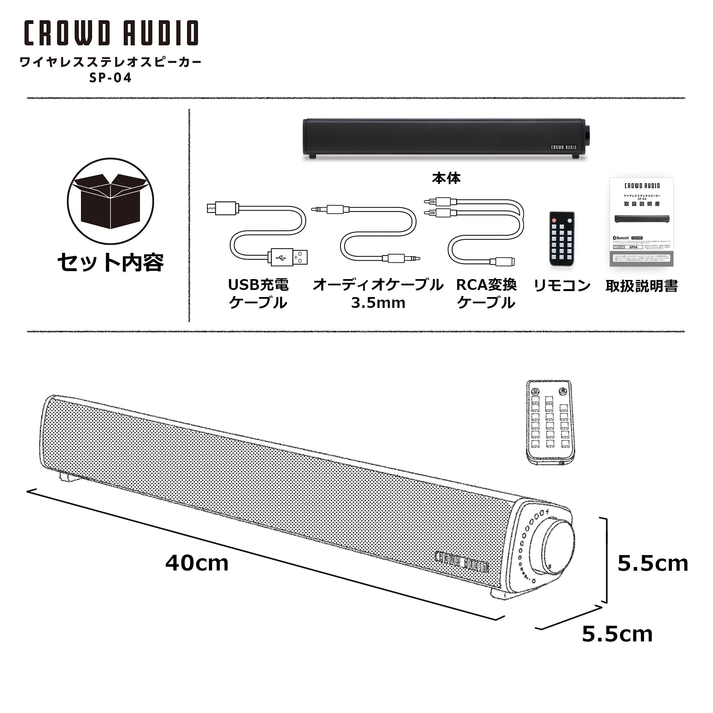 【スピーカー】■型式:2chスピーカー バスレフ型 ■スピーカー口径:Ф45mm ■再生周波数:60Hz~20,000Hz ■最大出力:5W×2 ■インピーダンス:4Ω 【その他】■電源:USB電源 2000mAh(3.7V) ■充電時間:約3時間 ※充電機器により異なることがあります。 ■連続再生時間:約24時間 ※使用状況・環境条件により異なることがあります。 ■使用温度範囲:5~35℃ ■対応フォーマット:mp3、wav ■対応メディア:microSDカード、microSDHCカード(~32GB) ■外形寸法:約W40×D5.5×H5.5cm ■質量:約533g ■付属品:リモコン、USB充電ケーブル、オーディオケーブル Ф3.5mm、RCA変換ケーブル