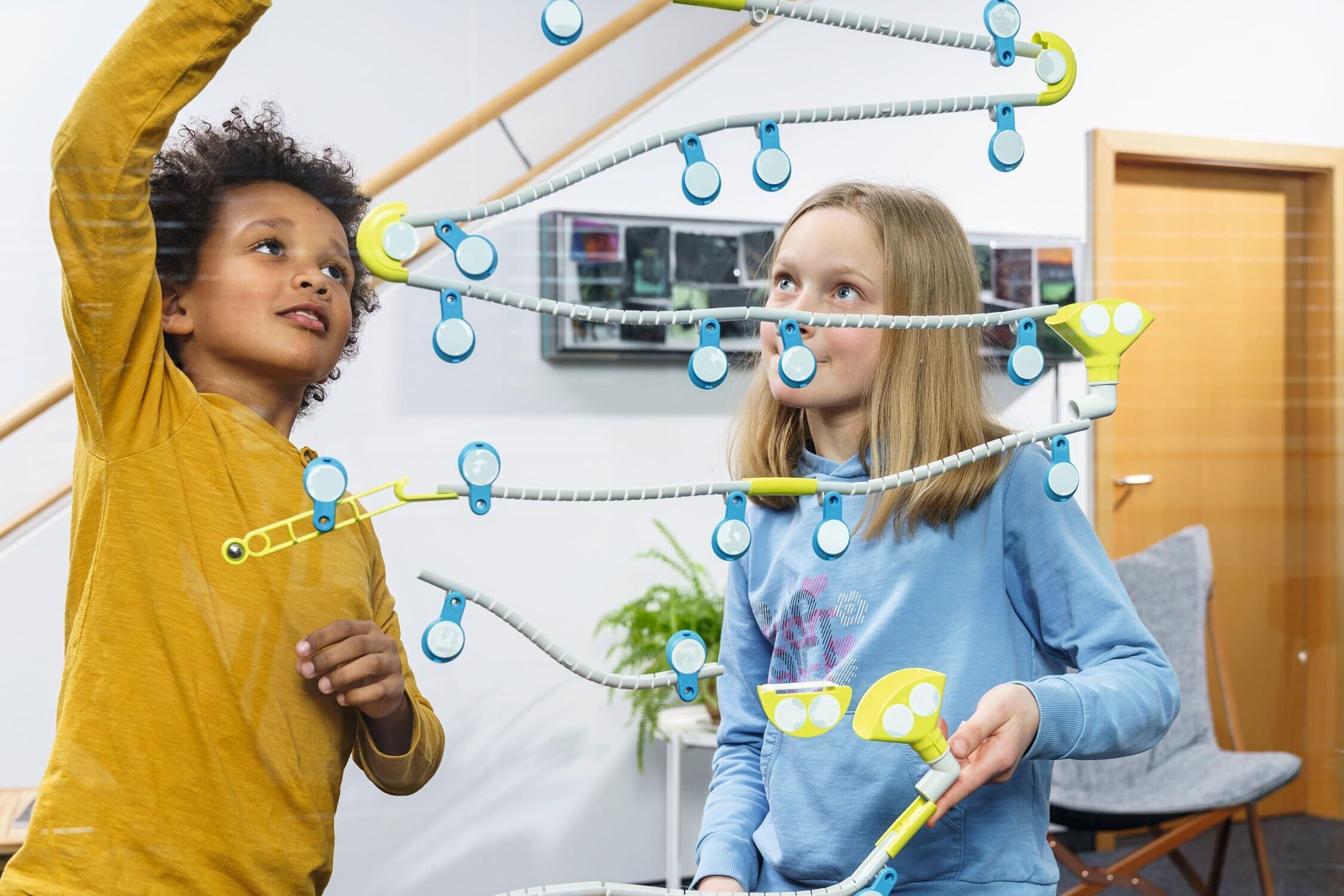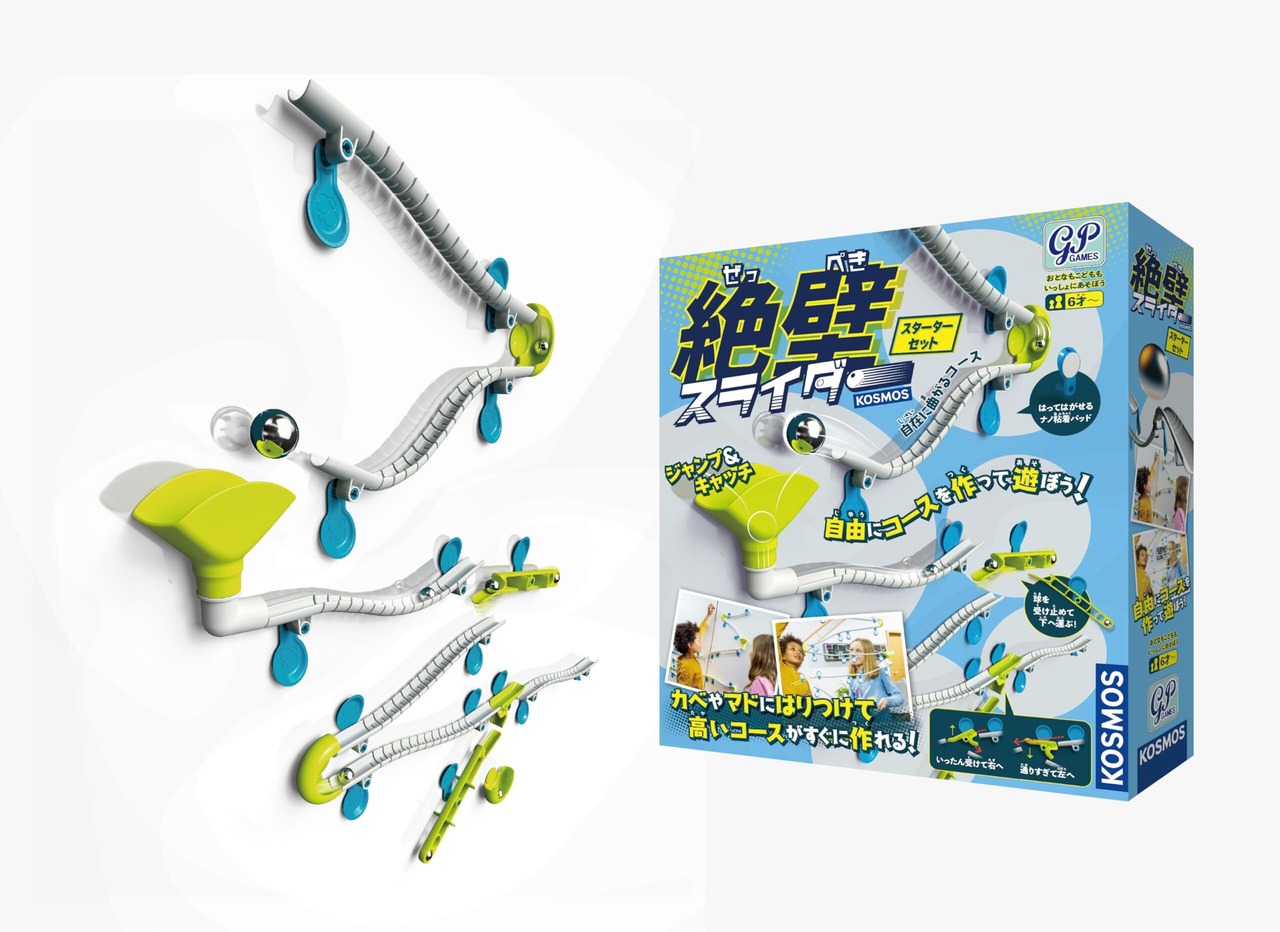 壁や窓に貼り付けて、高さのあるスライダーが簡単に楽しめる「絶壁スライダー」、床に場所が無くても、窓やドアなどのフラットな壁面があればどこにでも作れます! 遊びながら、重力や動力、遠心力などの原理を体感することができます。
