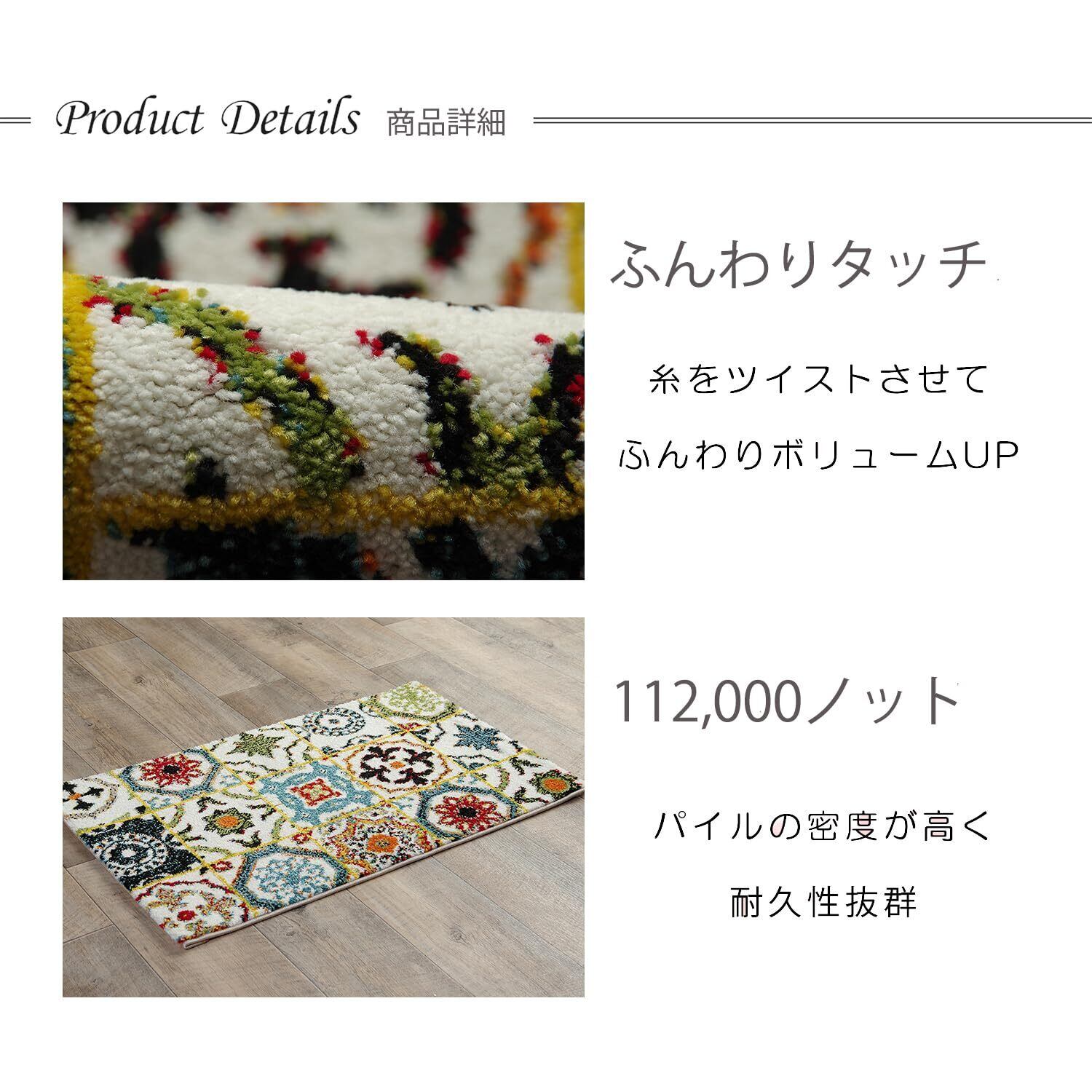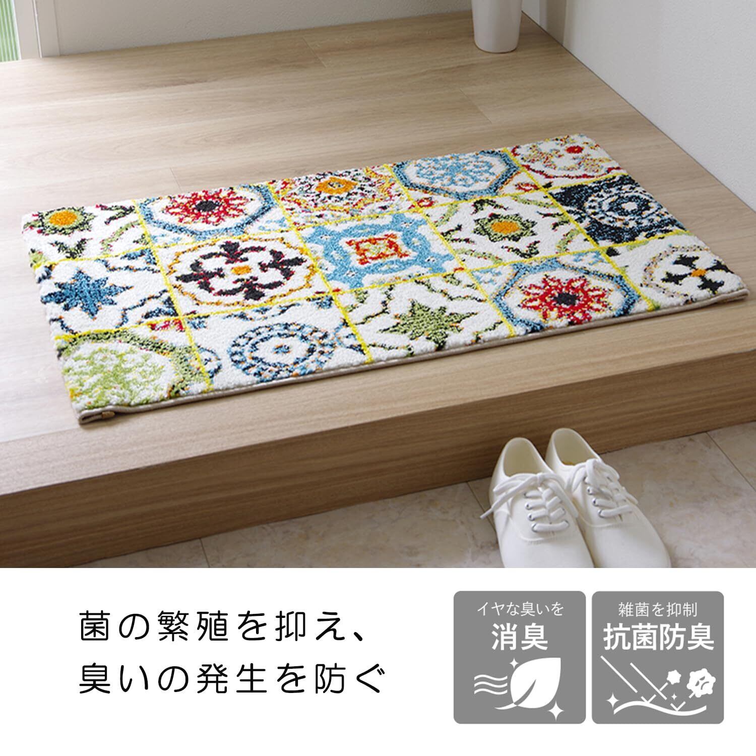 ウィルトン織りの玄関マットです。ラグでも人気の柄です。ウィルトン織りは非常に耐久性の高い織物です。家の中でも靴を履いて生活するヨーロッパで、土足で扱うことを前提として作られておりますので、長時間踏みつけてもヘタリにくく、弾力性もあり長くご使用頂けます。本商品の『繊維の密度を表すノット数』は112,000ノットです。本商品のパイル部分にはポリプロピレン素材を使用しております。ポリプロピレンはヘタリにくく、耐久性に優れ、繊維の中でも軽い素材です。また、汚れが付着しにくく、遊び毛や毛玉が非常に出にくいという特徴もあります。ホワイトをベースにカラフルな色で柄を出しています。玄関のワンポイントとして、ご使用していただきますと華やかになり高級感がでます。抗菌・防臭、消臭機能がついていますので、臭いが気になる玄関でも安心してお使いいただけると思います。