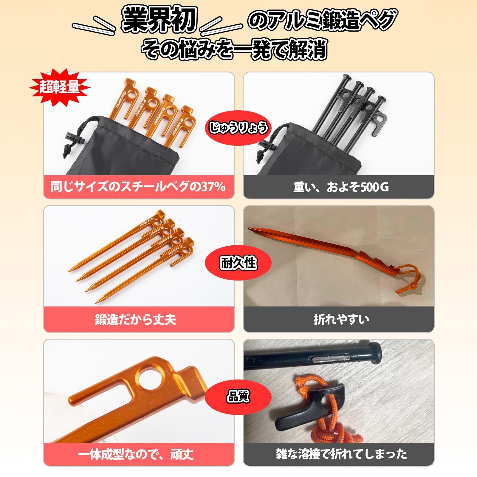 【巧みなデザイン】 :四角形状なペグヘッド部分:地中で回転しづらいため、打ち込みが容易におこなえます。 目立つ色に塗装された鍛造ペグは紛失しにくい。本製品の固定ロープに反射材が編み込まれております。夜中で撤収する場合、わずかな光があれば、すぐペグの位置を確認でき、視認性高くて回収することが易くなります。