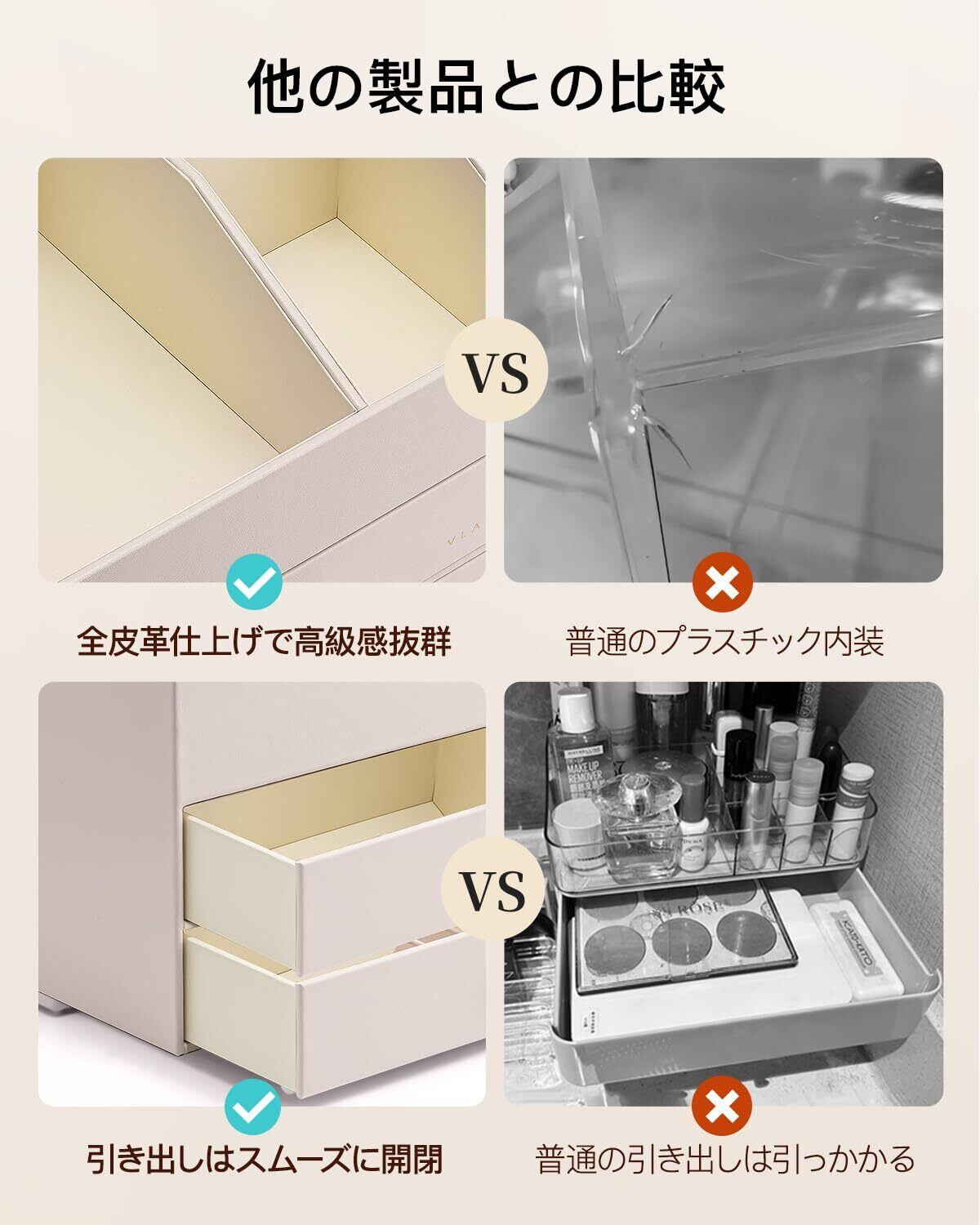 【大容量で使いやすい】3層の引き出しデザインで、アイテムを効率よく整理できます。上段にはスキンケア製品やリップスティックなどの細々したアイテムを収納でき、下段の2層には小物やアクセサリーを整理することができます。すべてのアイテムが見やすく、取り出しやすいのがポイントです。
