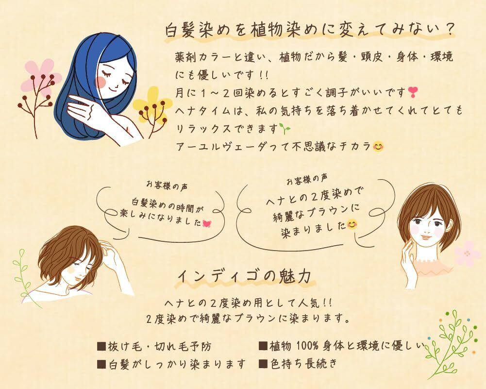 ●オーガニックインディゴ(ナンバンアイ葉)の天然染料です。印度農園100%オーガニックヘナの後に二度染め用としてご使用ください。40~60分程度の時間で自然なブラウン色に発色します