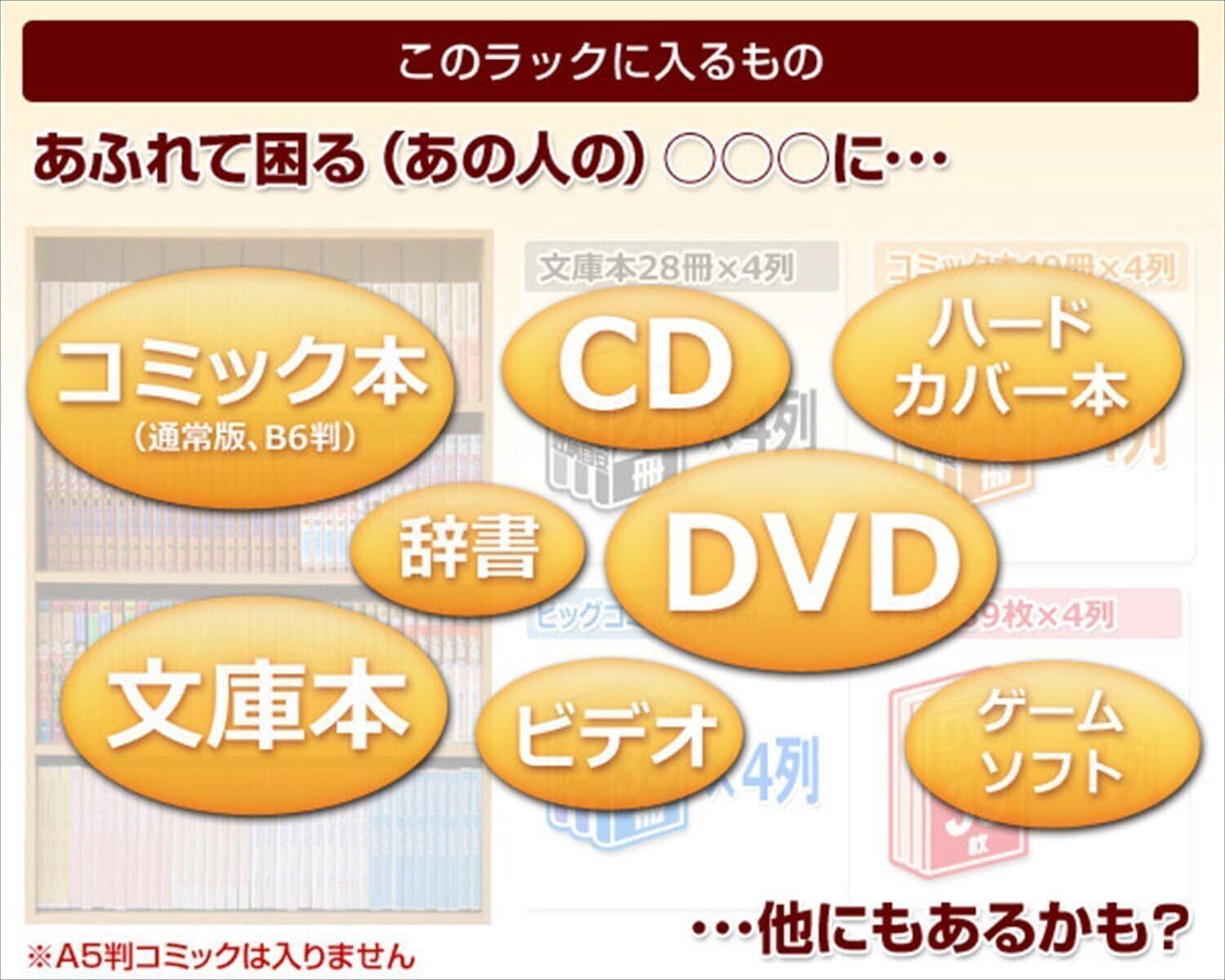 【スリムだけど大容量】コミック本なら約200冊とたくさん収納できるので、お部屋をすっきり片づけられるラックです。収納目安(最大) : コミック200冊、DVD180枚、文庫本150冊