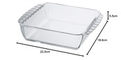 【商品詳細】本体サイズ:幅22.5×奥行18.9×高さ5.5cm、本体重量:790g、満水容量1300mL、本体材質:耐熱ガラス、日本製