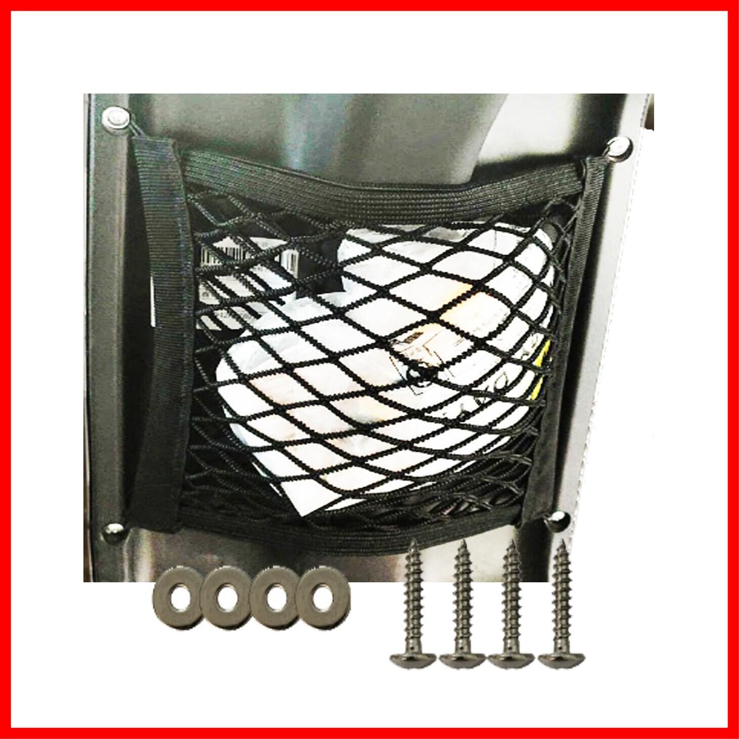 原付、スクーターのフットレスト前方に取り付ける荷物収納ネットポケットです。固定用ネジ4本、平ワッシャ4個付属。