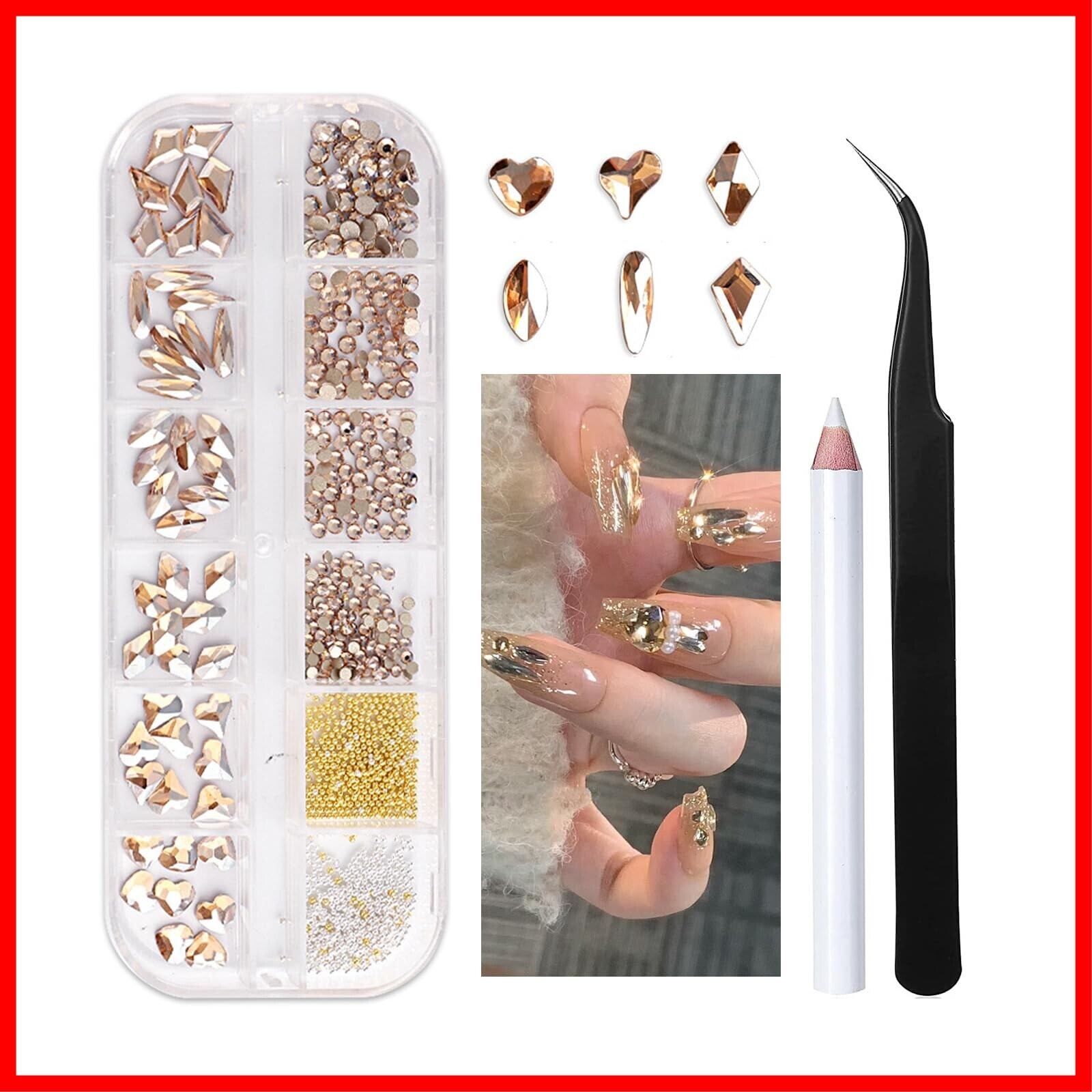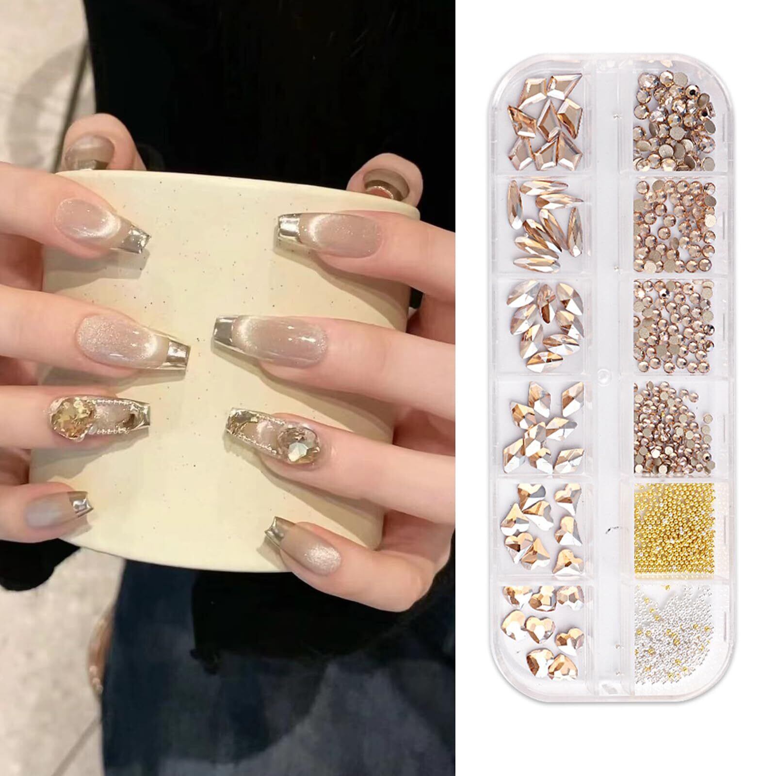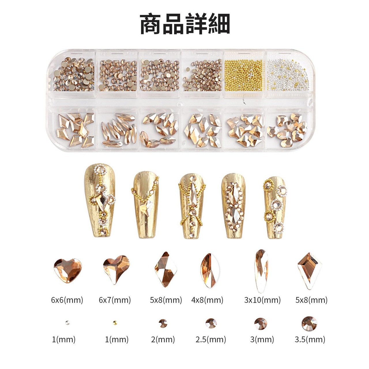【数量】約8種類のラインストーン。形はダイヤ、スクエア、ラウンド、ハートなど。 また、丸いラインストーンの大きさが4種類、小さなゴールドビーズとホワイトパールが混ざったものが2区画あります。サイズは1mmから8mmまで。すべてのネイルデコレーションニーズに適しています。初心者やDIYデザイナーに適しています!