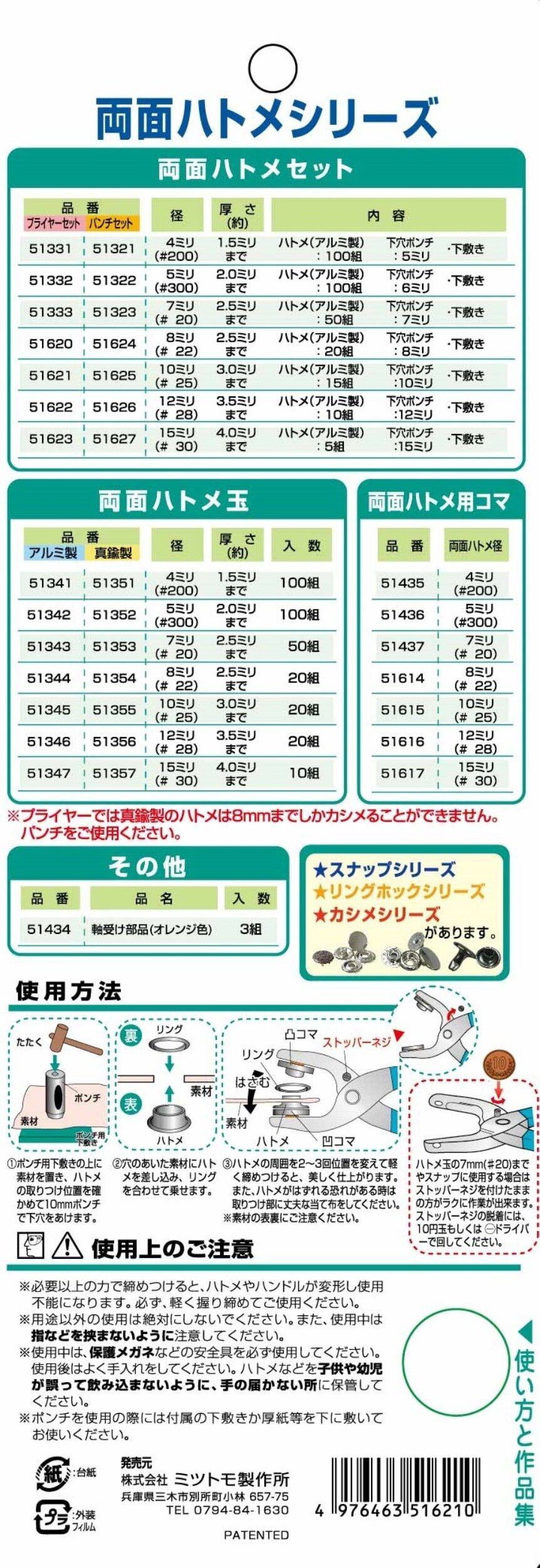 セット内容:10mm(#25)(厚さ約3mm迄)ハトメ玉/15組入り 下穴ポンチ10mm/1個 下敷き/1個