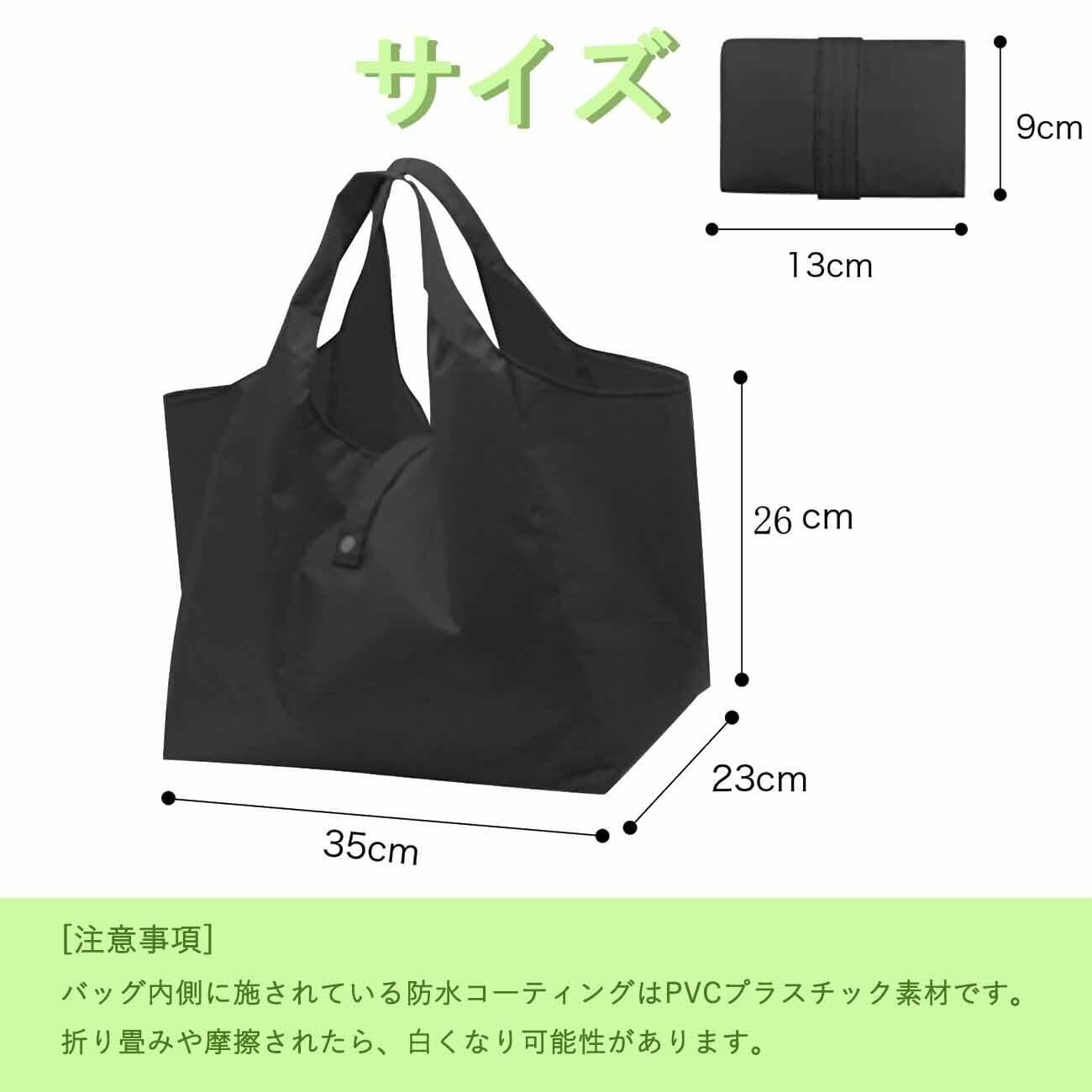 【製品詳細】耐加重20kg、折り畳み9cm x 13cm、広げると長さ35cm×幅23cm×高さ33cmと大容量エコバッグです。