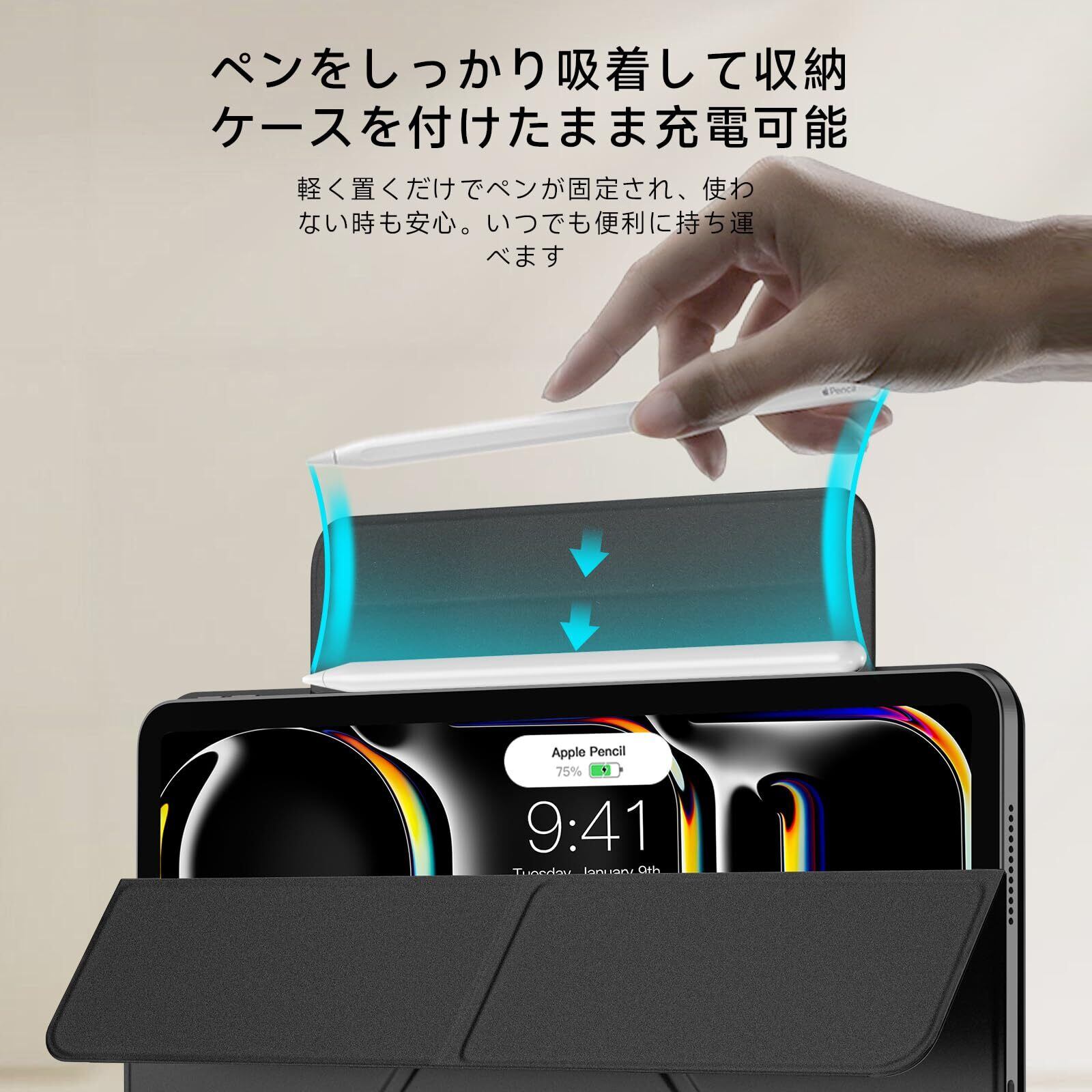 【内蔵式のApple Pencil用ストラップ】隠れたマグネット式ペンシルストラップが、充電中のペンシルをしっかり保持し、外出先での落下を防ぎます。使用しない時はストラップを折りたたんで背面パネルに隠し、ipad pro ケースのミニマルでスマートな外観を保つことができます。
