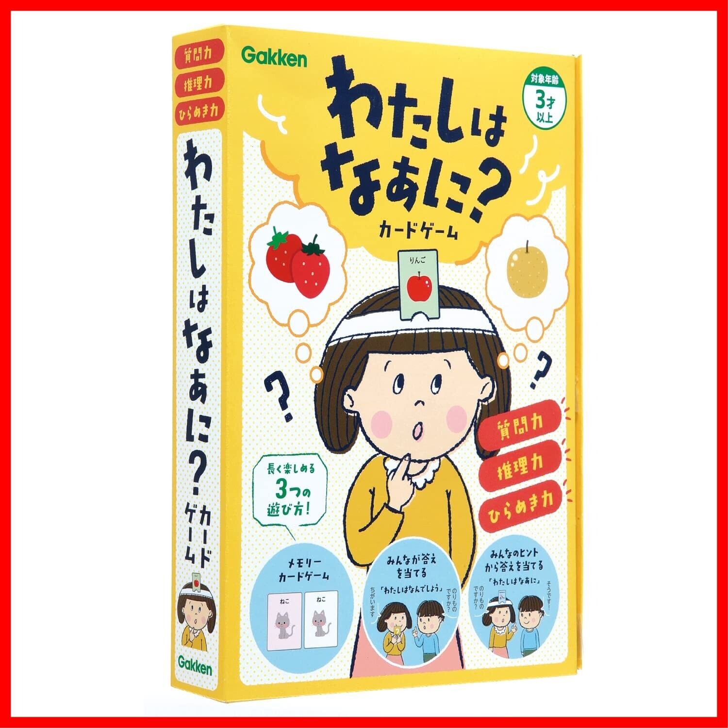 質問力や推理力を鍛える、長く楽しめる3つの遊び方ができるカードゲーム 3パターンの遊び方ができるカードゲームです。レベル1:メモリーカード遊び 2:わたしのもっているカードをみんなであてる、「わたしはなんでしょう?」ゲーム遊び 3:わたしのもっているカードをわたしがあてる、「わたしはなあに?」ゲーム遊び いずれの遊びも文字が読めなくても遊ぶことができ、遊び方2と3では、質問する力や、発想力を遊びながら身につけることができます。