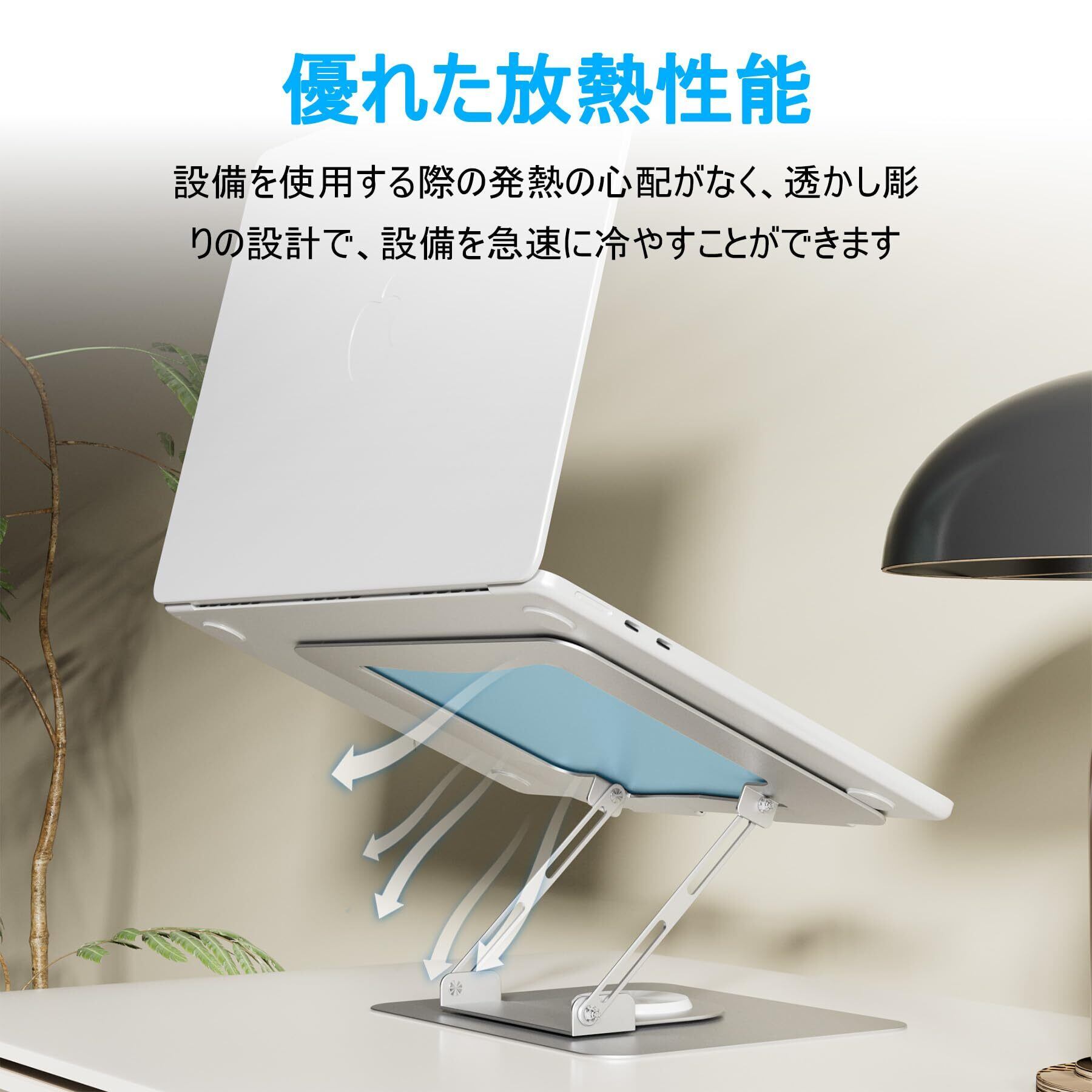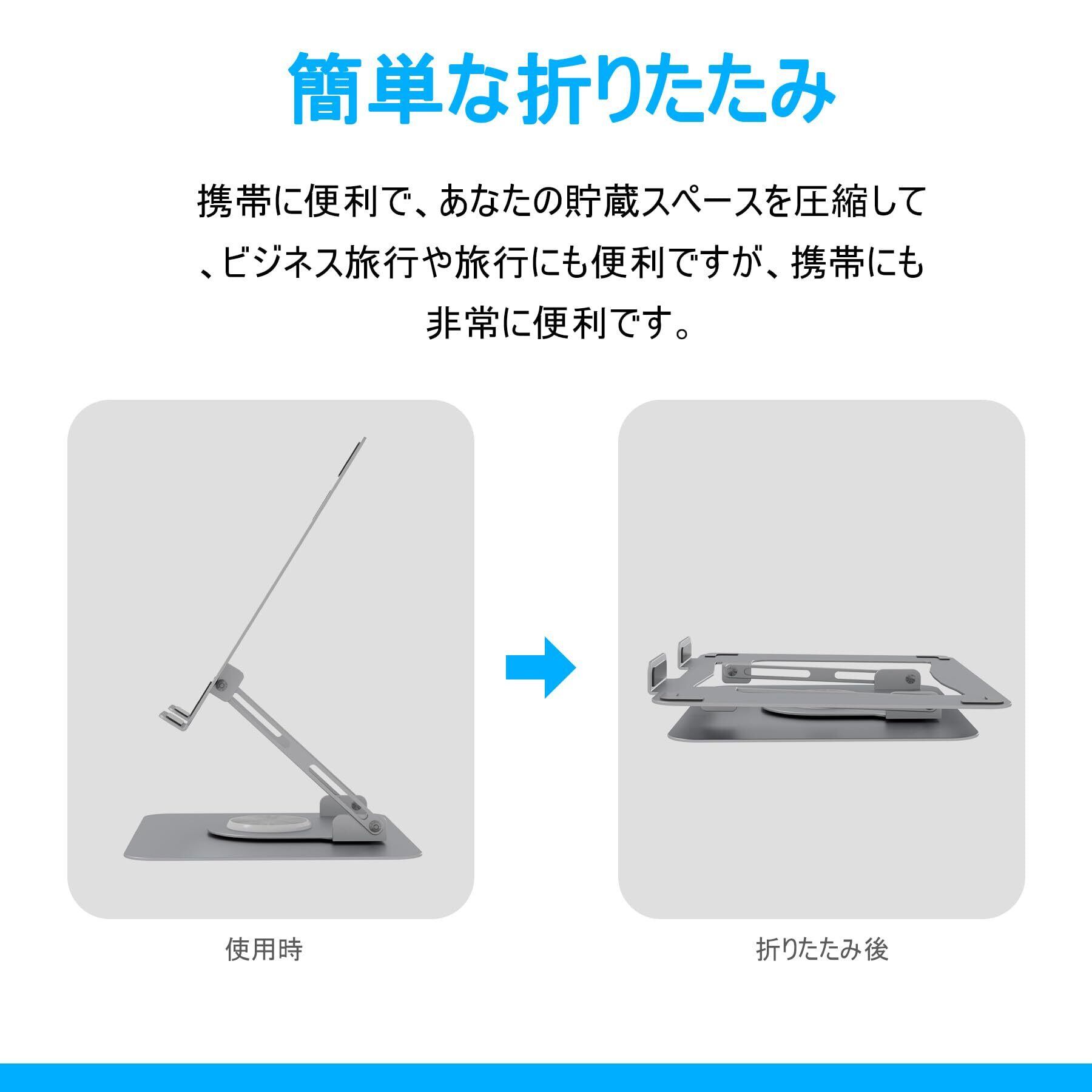 【人間工学に基づいた設計】自分の身長とデスクトップの高さに合わせて、ノートパソコンスタンドの高さを簡単に調整して、最も快適な使用状態にすることができます。このスタンドは0 ~ 180度の自由な調節をサポートし、底部は360°回転することができ、異なる使用シーンでのニーズに対応しています。適切な角度を調整することで、首や肩の疲れを軽減し、猫背を改善し、作業効率と快適さを高めることができます。