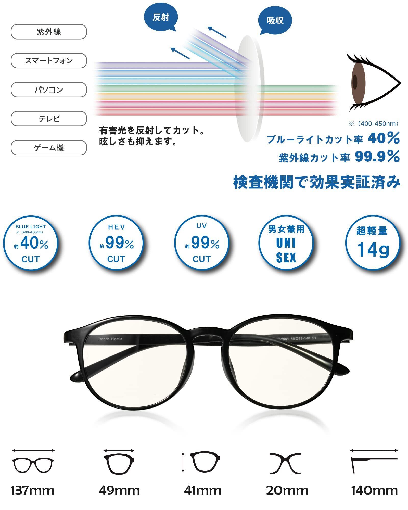 【素材構成】 『フレーム素材』:超軽量弾力「FRENCH PLASTIC G850」 『鼻パッドの形状』:フレーム一体型 『レンズ』:高品質プラスチック/ブルライトカット率40%/UVカット率99%/HEVカット率99%