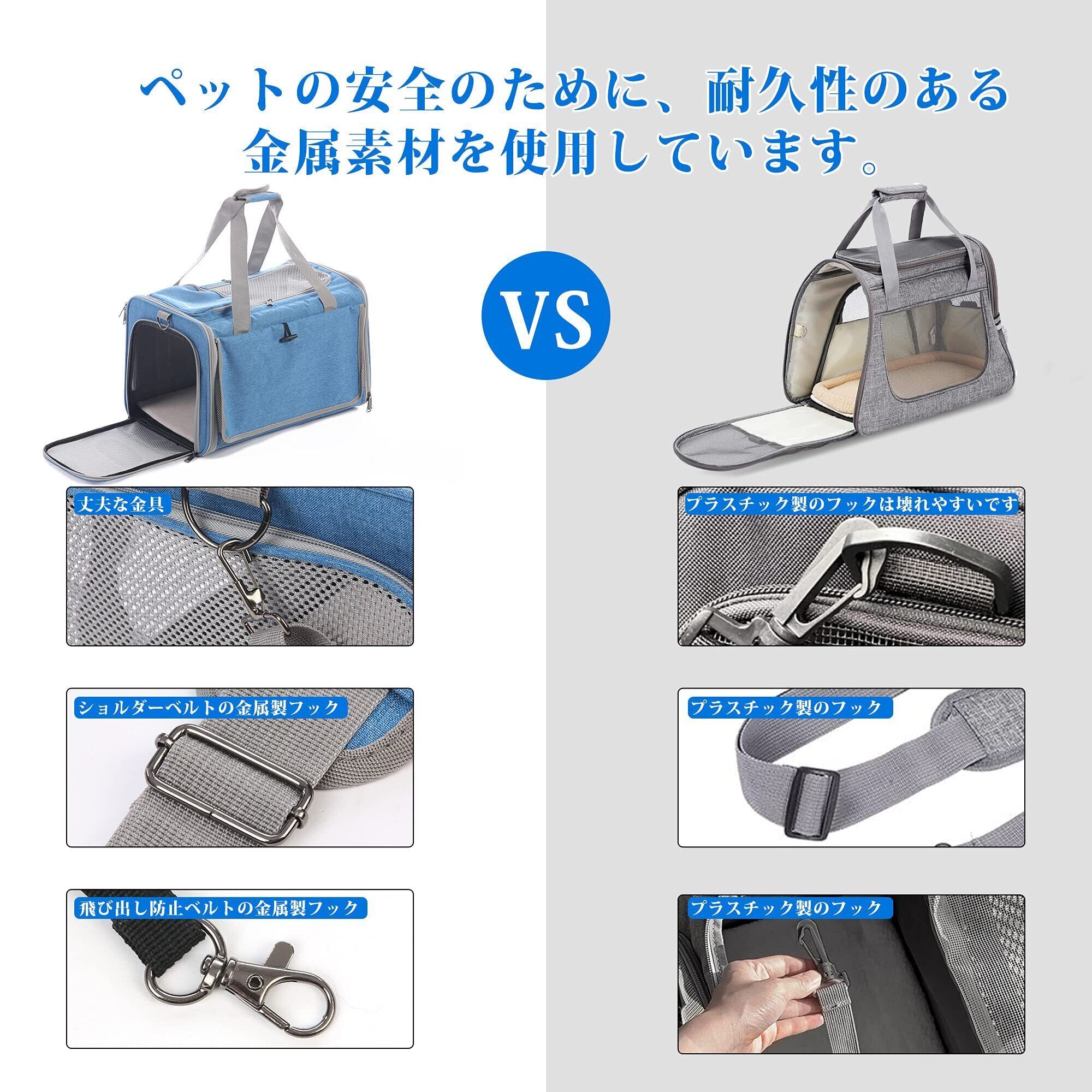 【材質改良】 ペットの安全のために、耐久性のある金属素材を使用しています。ショルダーストラップのフック、ストラップの長さを調整するバックル、飛び出し防止ベルトのフックは、壊れやすいプラスチックのフックではなく、耐久性のある金具を採用しています。壊れやすいジッパーではなく、安全なジッパーを使っています。ペットの快適さのために、ペットにやさしい素材を採用しています。硬い悪臭のゴム網ではなく、靭性で快適な織物網面を使っています。薄い普通の生地ではなく、厚手のオックスフォード生地を使っています。