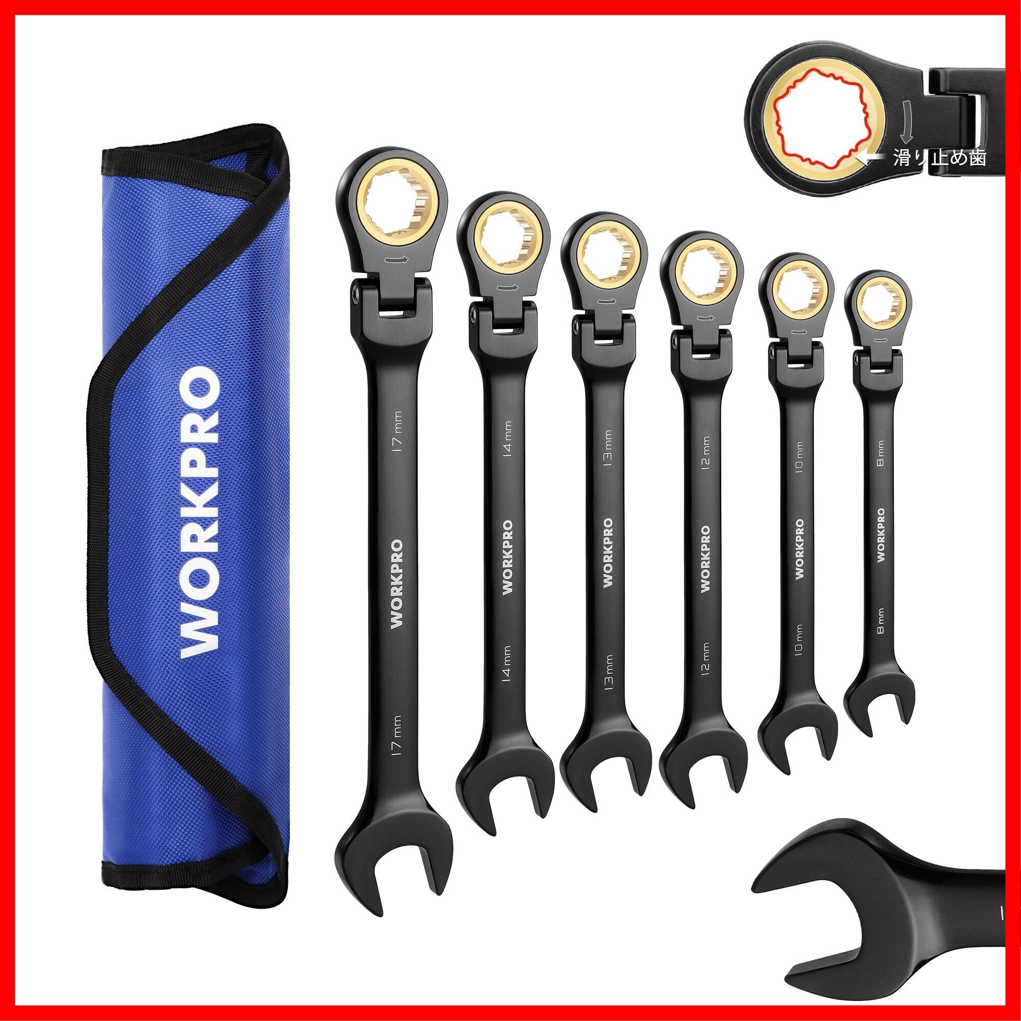 WORKPRO コンビネーションレンチ フレックスラチェットレンチ 6本組 首振りラチェット スパナ なめたボルト・ナット対応可能 72ギア 両用ヘッド CR-V製 組み立て 自動車修理 メンテナンス用 収納袋付き