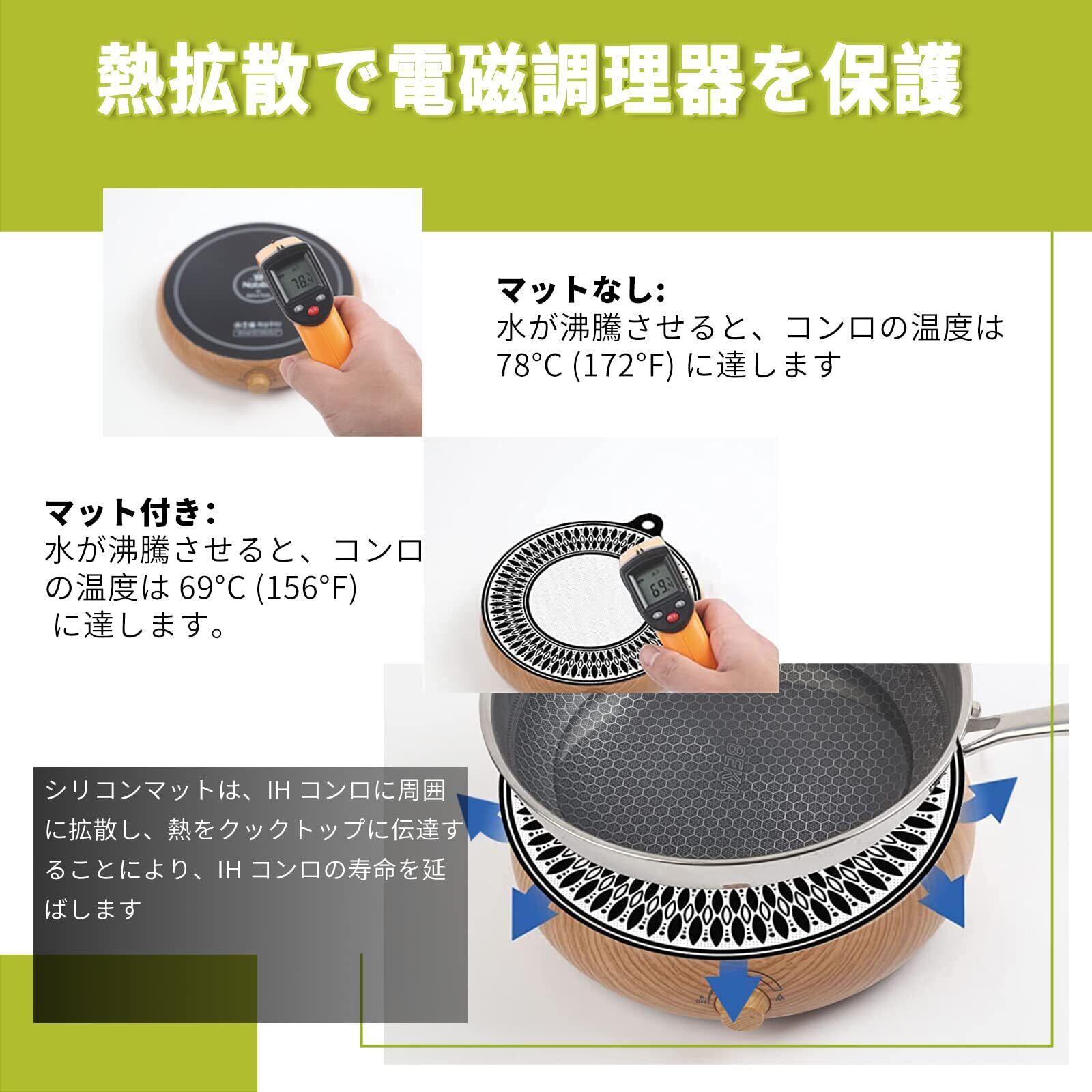 【ihクッキングヒーターの保護に最適】IHを使っていると、黒ずみができ、それを落とすのがけっこうやっかいなのですが、本製品を敷くことで保護できる。表面はシリコンシートに黒ずみが出来ます。IHの面には黒ずみが出来ません。直接調理器具がIHに接しないので黒ずみ防止には役立つようです。鍋底がIH調理器表面に当たるとき、本商品を載せているとクッションのようになるので、磁器がぶつかるような音がは出ない。単に汚れ防止だけでなく電磁波の分散になるらしく家電を長持ちさせる効果もある 。